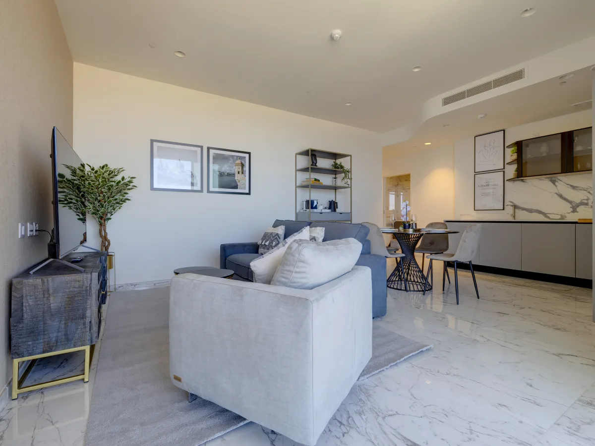The suite, with a footprint of 68sqm features high end finishes with modern furniture and lovely furnishings, where floor to ceiling apertures offer stunning views of the surrounding area. Bursting with natural light, a lovely lounge and dining area flow seamlessly onto a lovely terrace which is equally shared with the bedroom. The open plan layout makes for a spacious and airy living space, perfect for entertaining guests or simply relaxing in style. A fully equipped kitchen is undeniably a chef's delight!
