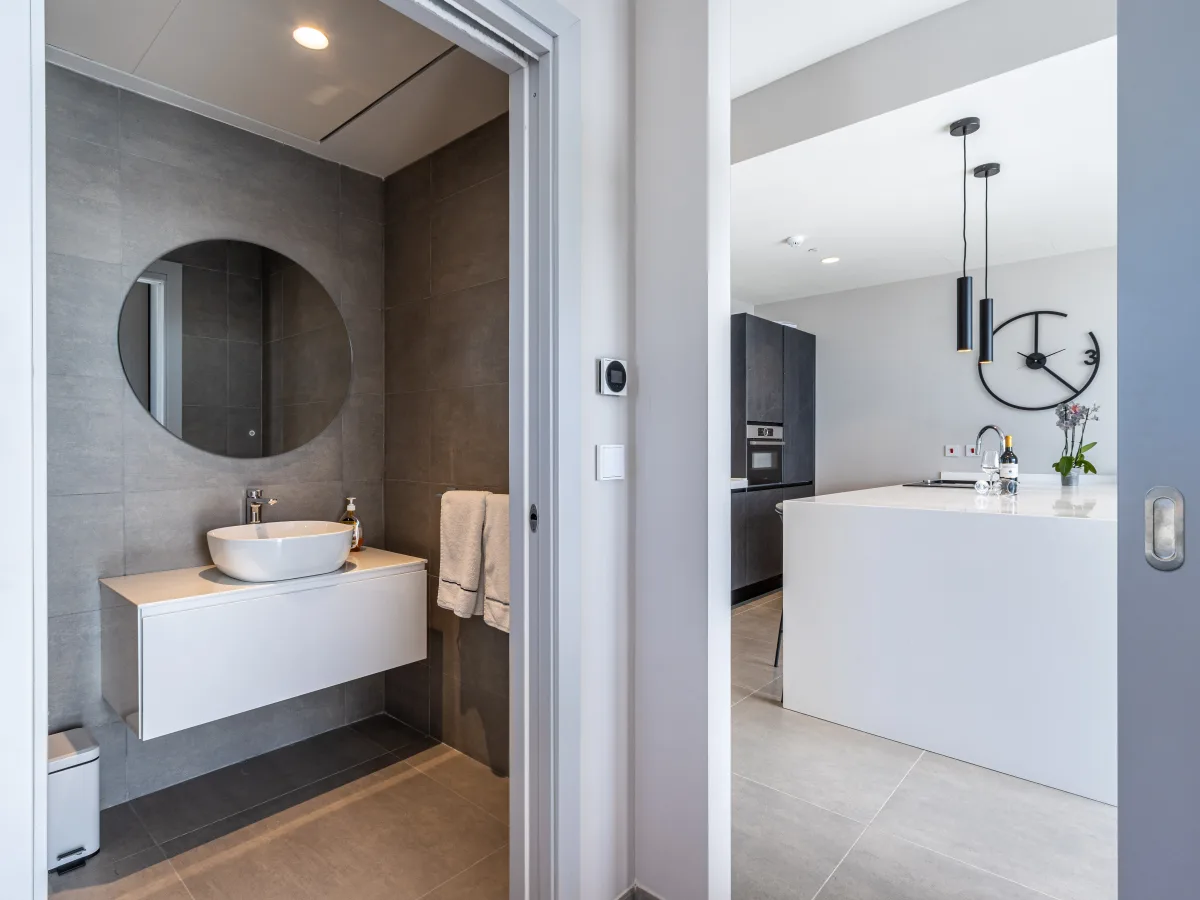 With a south facing orientation and having 57 sqm. of internal space, a gorgeous living room and fully equipped kitchen breakfast room flow seamlessly out to a lovely terrace where the views, as far as the eyes can see, create an amazing backdrop. Further complimenting this apartment is a beautiful bedroom where its floor to ceiling apertures open up to the same stunning terrace which runs the full length of the apartment. A bathroom and utility/laundry room complete this wonderful space.