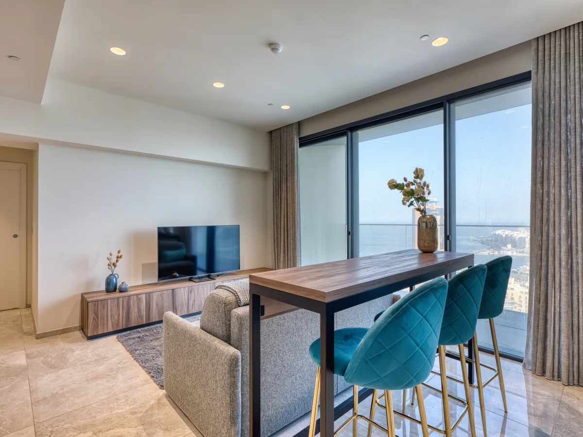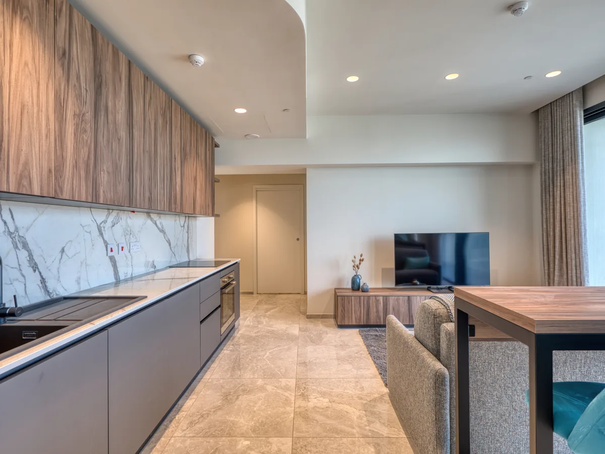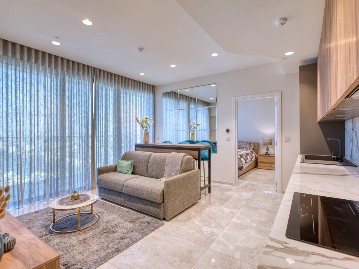 The well-designed layout with a footprint of 68 sqm features an open plan kitchen, living and dining area that flows seamlessly onto a terrace, offering stunning views. A spacious bedroom, a stylish full bathroom, and a convenient laundry area complete the space.