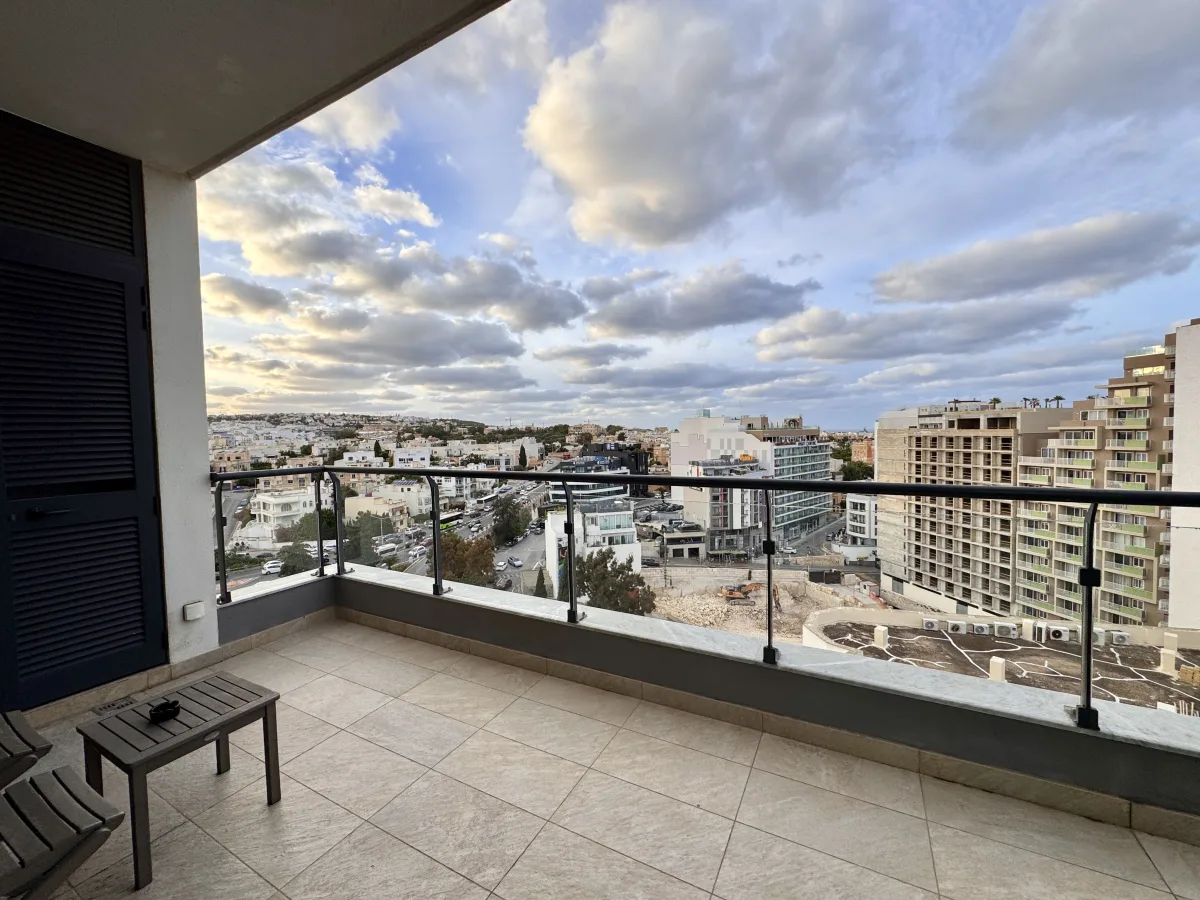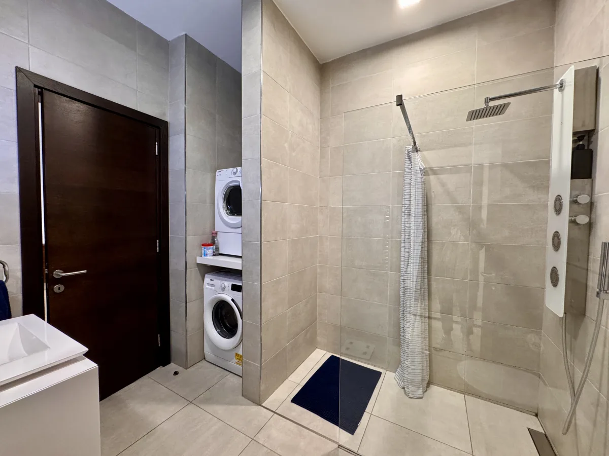 The apartment features a spacious double bedroom with its own private balcony, main bathroom with two doors and a modern open-plan kitchen, living, and dining area that leads onto a generous front terrace, ideal for relaxing or entertaining.