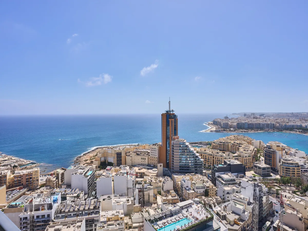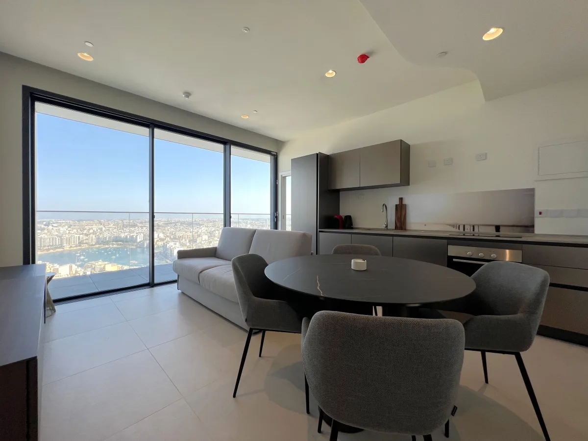 As one enters into the residents’ section of the Tower it is apparent that no expense has been spared, with a welcoming reception, card access to the communal parts and finishes that one would find at 5 star hotels around the world. The apartment has a well lit and spacious entrance hall which leads into the open plan kitchen living dining area. The eyes get drawn immediately to the breathtaking view, as light and a sense of space, fills the room. The bedroom is very nicely sized with ample storage and again, stunning views across St Julian's towards Valletta and beyond.