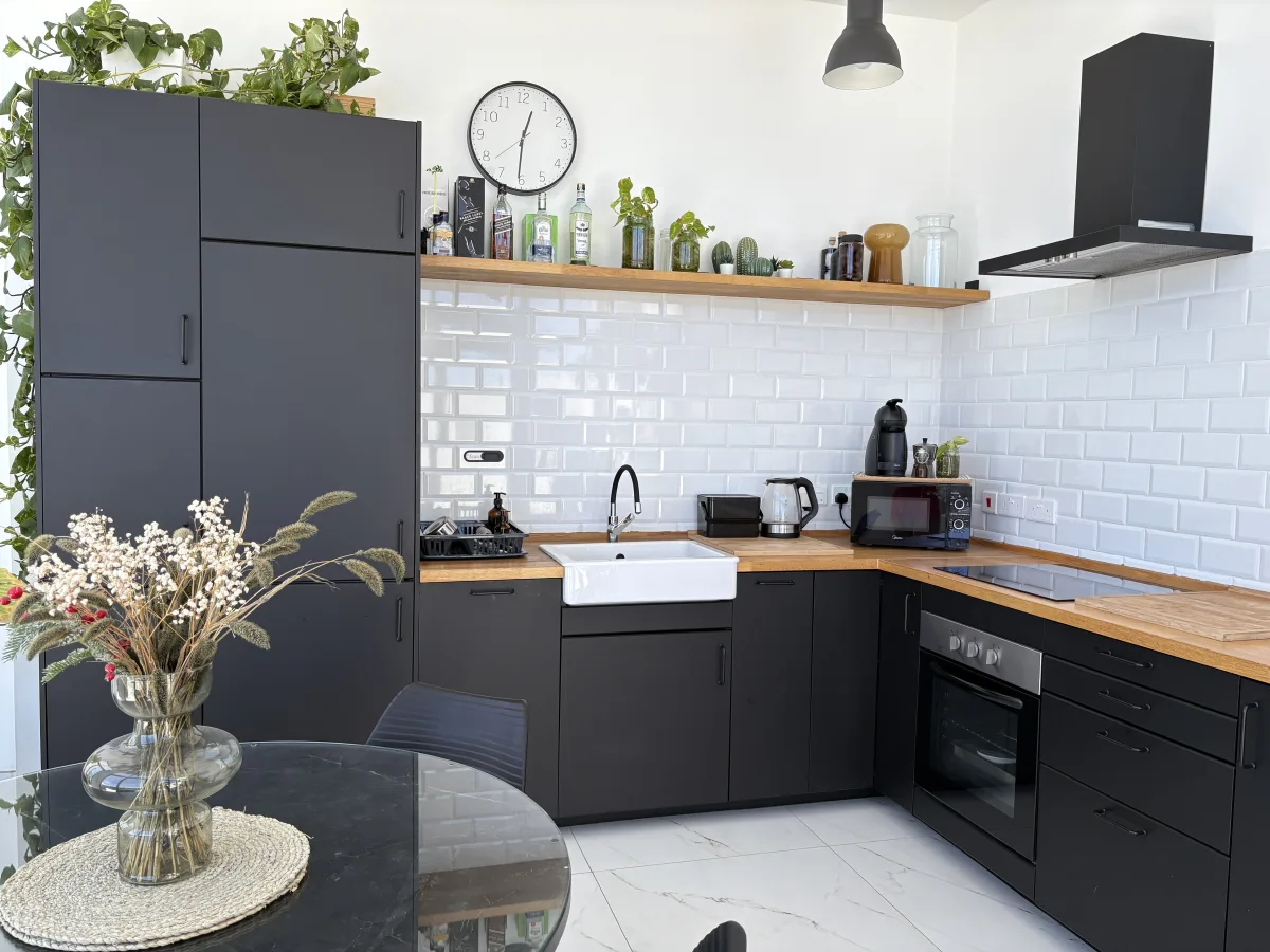 Inside, the open-plan living area is warm and functional, featuring a 3-seater chaise longue sofa that converts into a bed, a 4-door storage unit, and a dedicated desk space. The fully equipped kitchen is a chef’s dream with abundant storage, a built-in bar area perfect for your morning coffee or evening drinks, and high-end appliances including a dishwasher, microwave, oven, and fridge freezer.