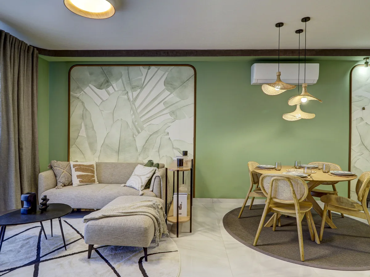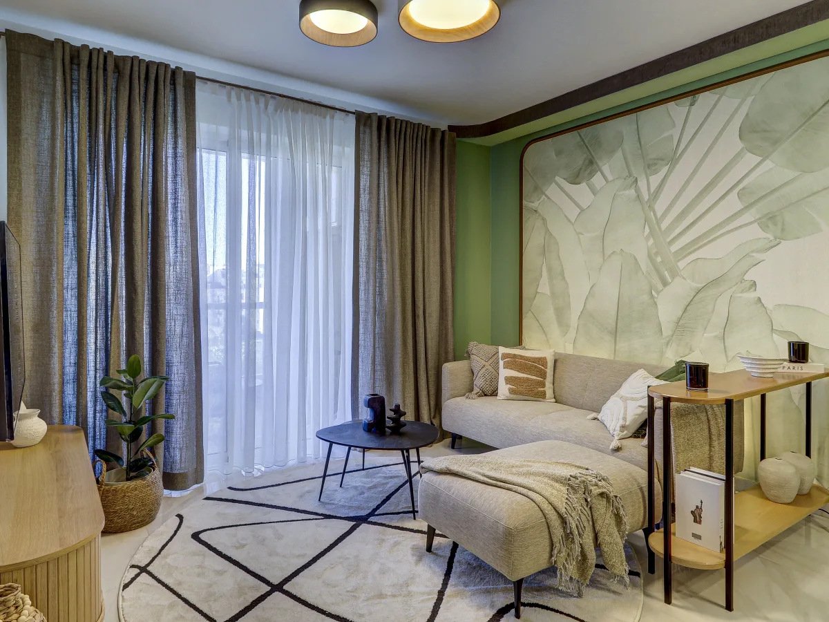 The state-of-the-art kitchen boasts a seamless countertop and premium Bosch appliances, including an induction hob and dishwasher, paired with a striking Grohe copper tap for a perfect blend of style and functionality. Every door in the apartment is adorned with designer hardware, while the interiors are enriched with exclusive details such as carefully curated wall murals, bespoke designer wallpapers, solid wood furniture, and sumptuous textiles, creating an atmosphere of refined elegance throughout the home.