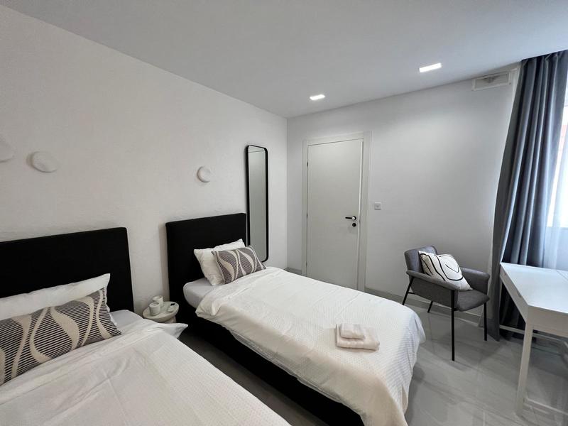 The sleeping quarters comprise a master bedroom with en-suite bathroom, complemented by a second bedroom with two single beds, and a spacious main bathroom.