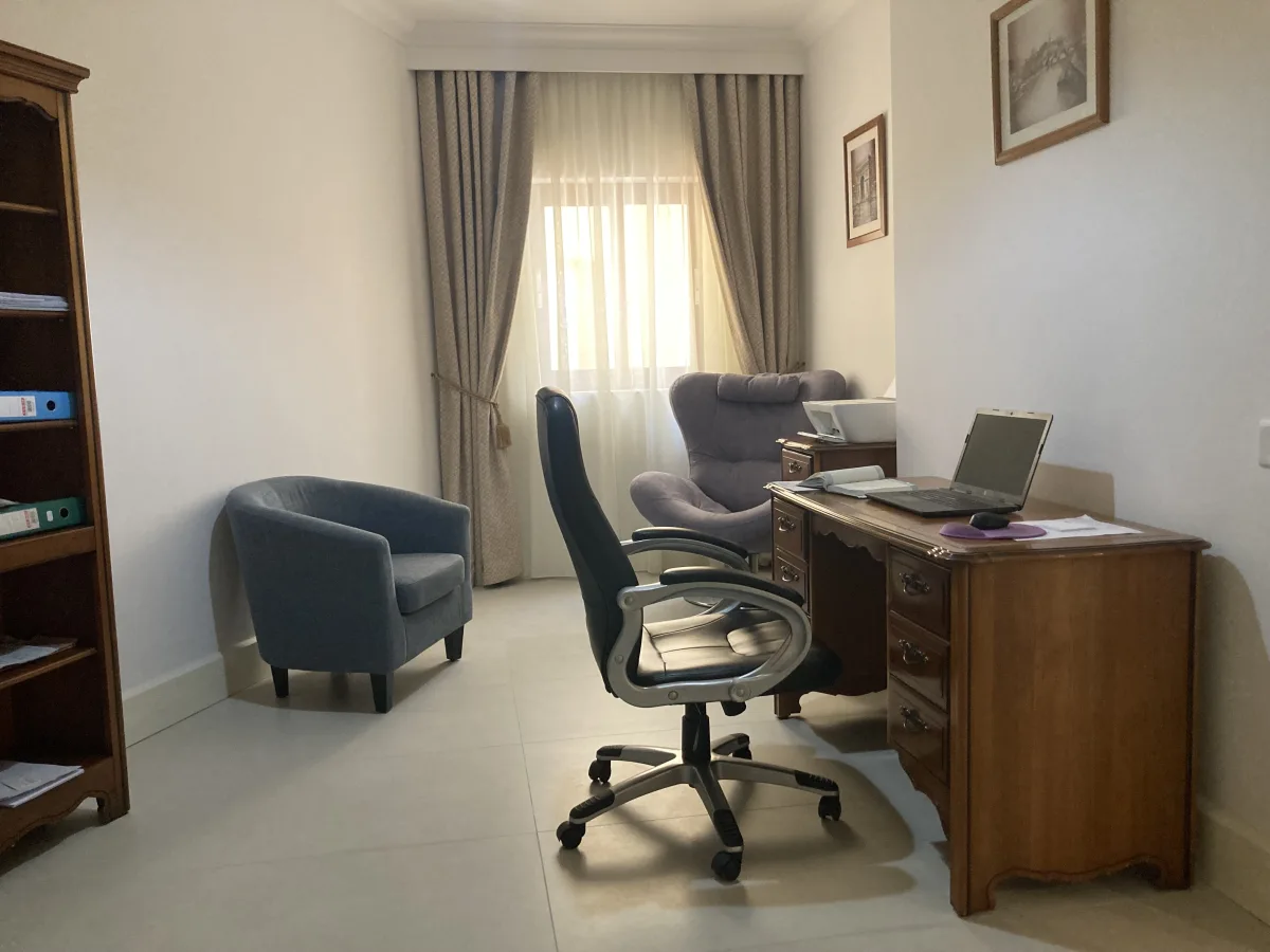 The brand new, fully fitted kitchen features modern appliances and flows seamlessly into a dining area for six, leading to a bright and inviting living space. Large glass sliding doors open onto the private terrace, where residents can relax, dine al fresco, or sunbathe amid the lush landscaped gardens that surround the property.
