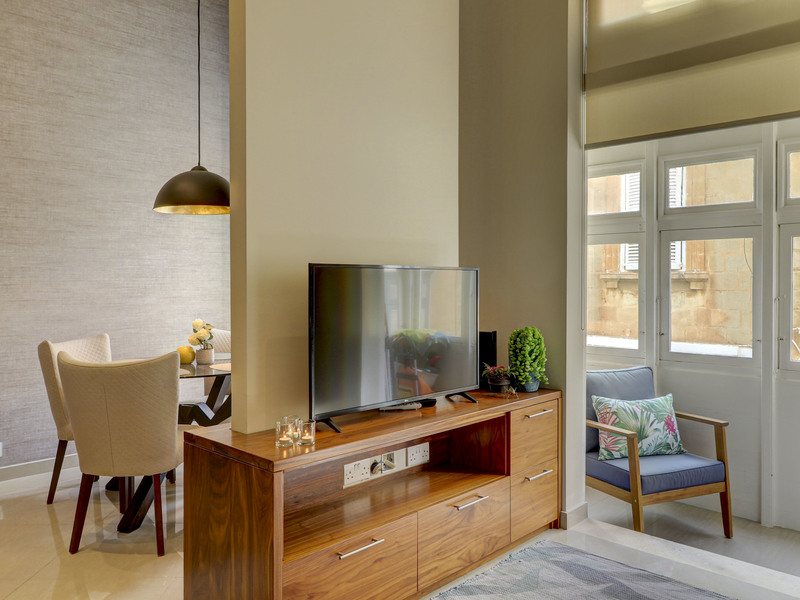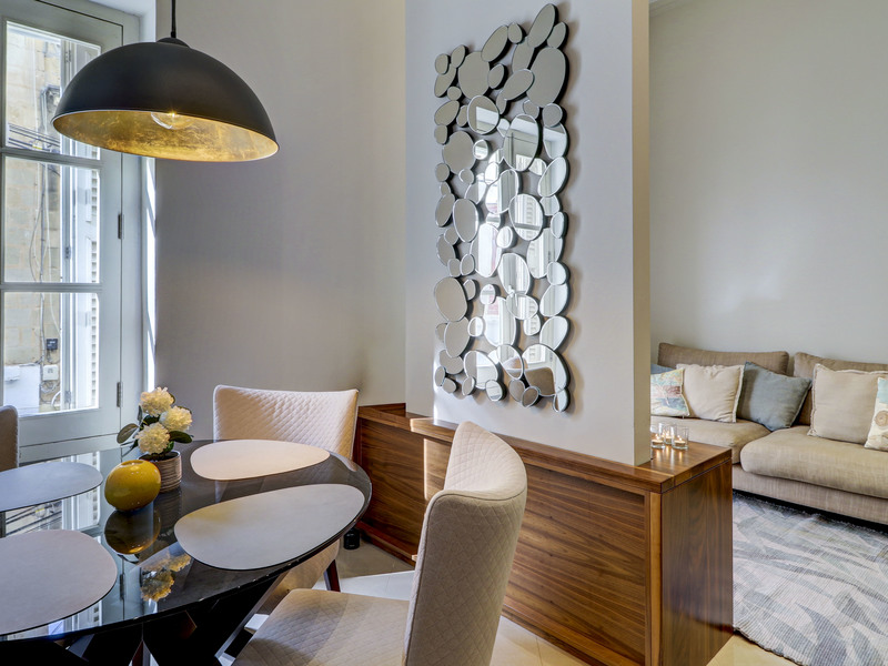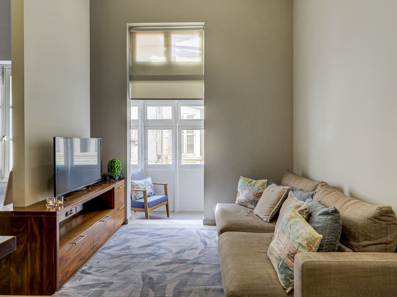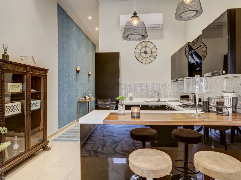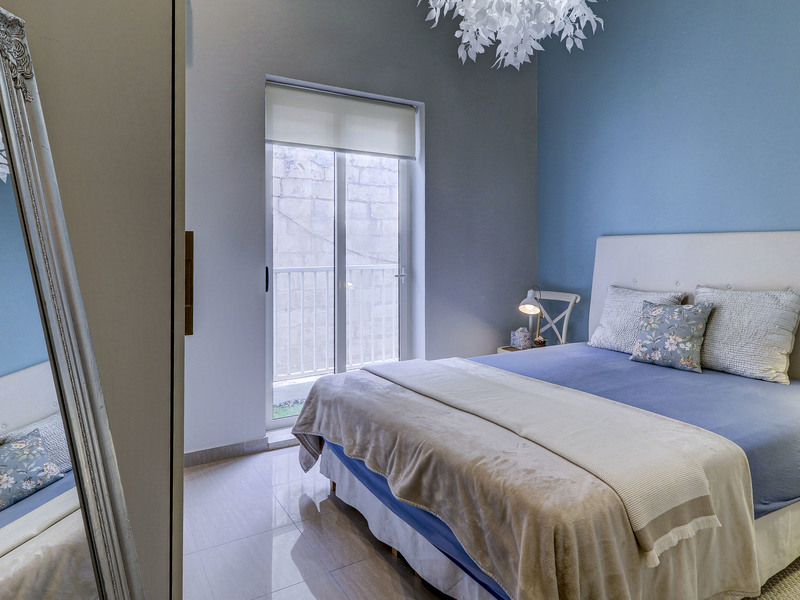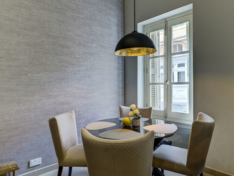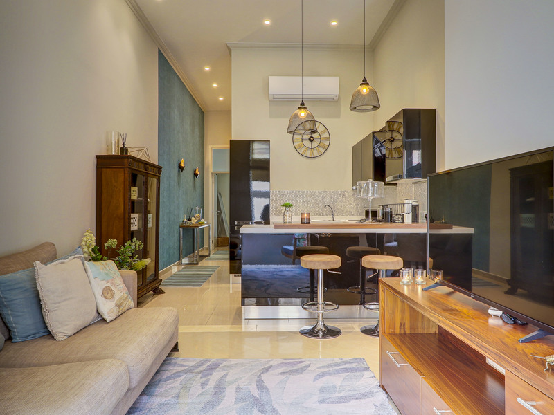 Forming part of a traditional townhouse, the property enjoys soaring ceilings that enhance the sense of space and natural light throughout. Situated on the first floor and served by both lift and stairs, the welcoming entrance opens onto an attractive dining area that flows seamlessly into a cosy living room. From here, a traditional timber balcony invites abundant natural light, creating a warm and inviting living space. A fully equipped and functional kitchen completes the main living quarters, perfectly suited for immediate occupation.