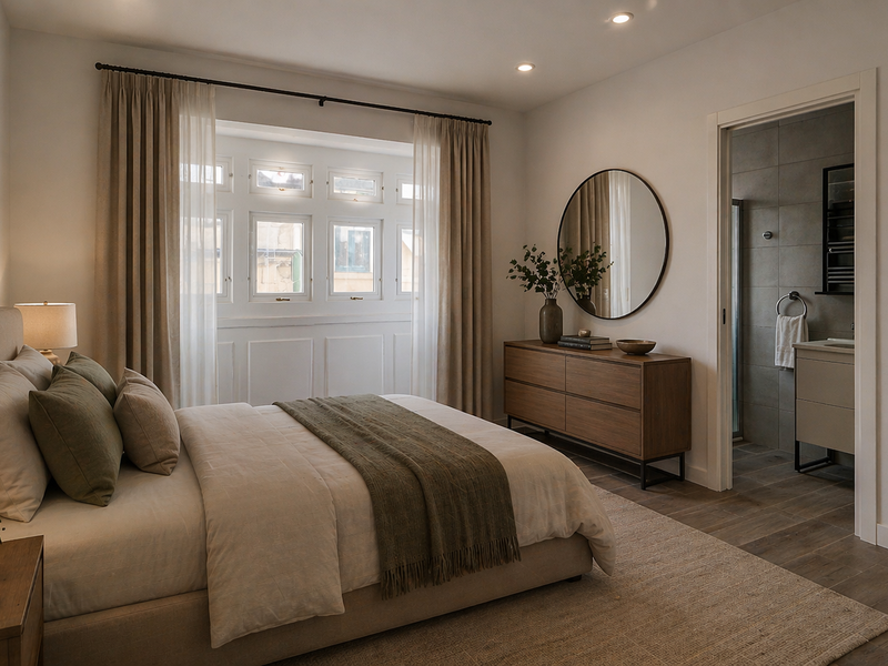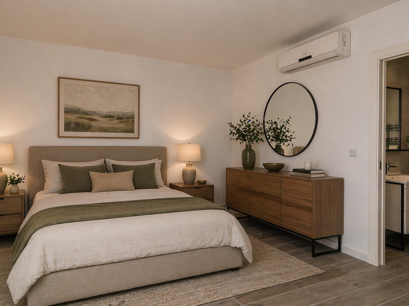 This corner apartment offers two generously sized double bedrooms each with its own en-suite facilities. Additional features include a dedicated study area, a washroom or utility room, and a guest powder room.