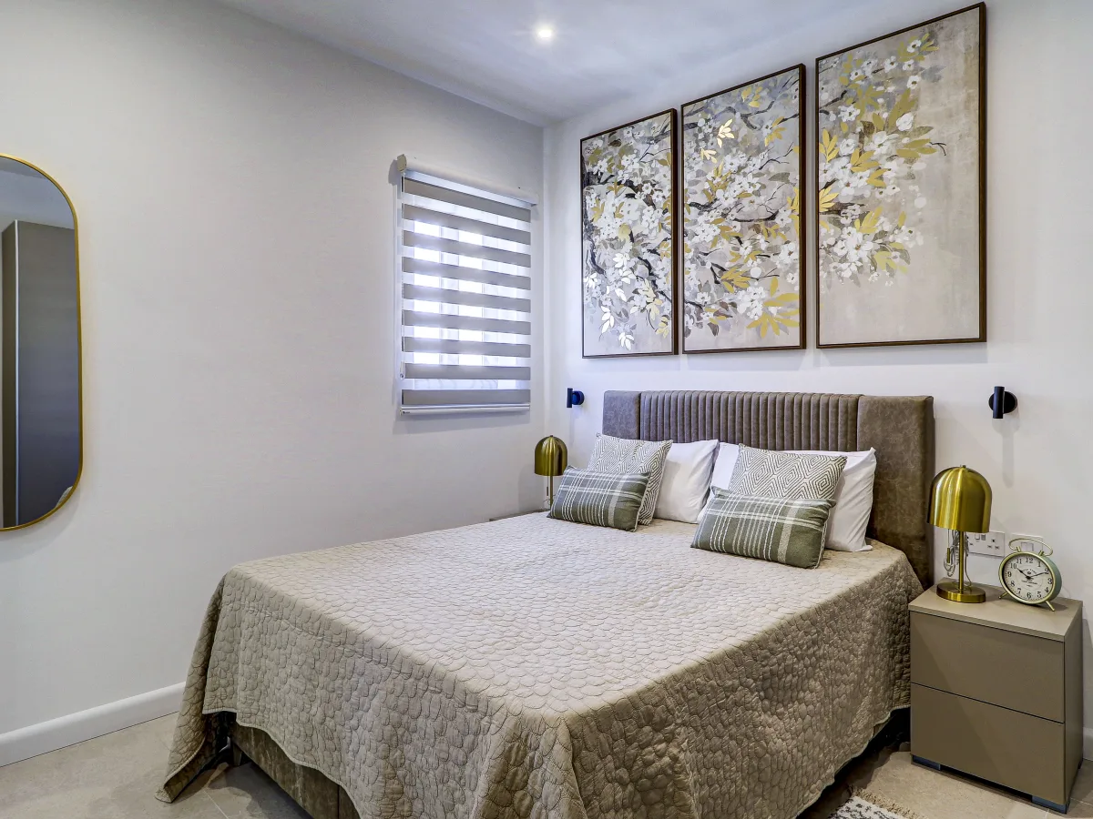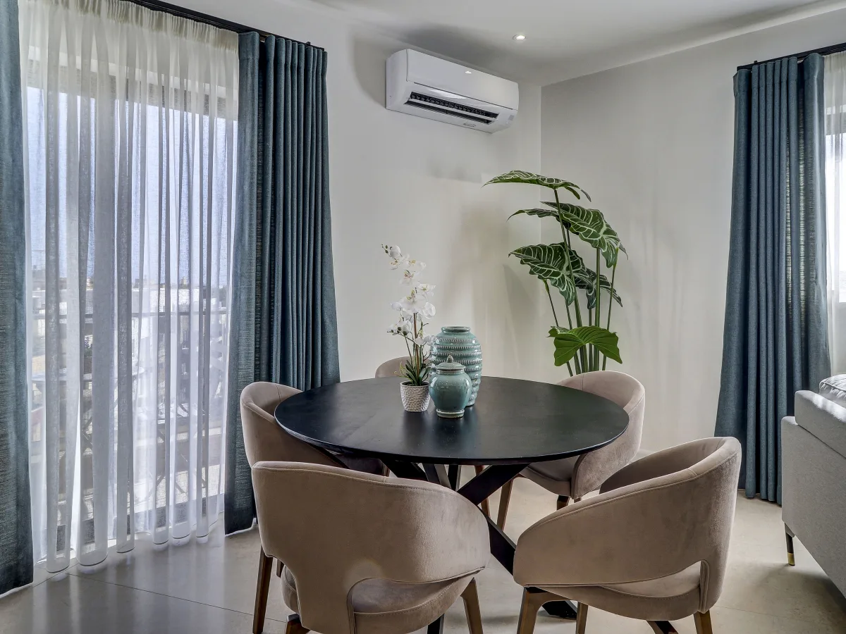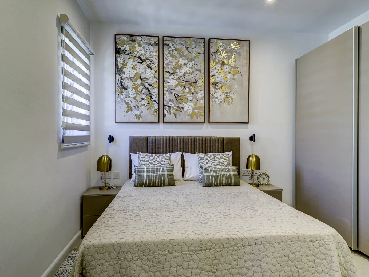 Upon entering, one is welcomed by a welcoming hall leading to the master bedroom boasting en-suite facilities with walk-in shower. There is a family bathroom with bathtub, next to a spare bedroom with two single beds. The open plan kitchen, living and dining area located at the back of the property enjoys distant sea view through a window and opens out onto a balcony with coffee table and two chairs. The property is fully equipped including a washing machine, tumble dryer and air-conditioned throughout.