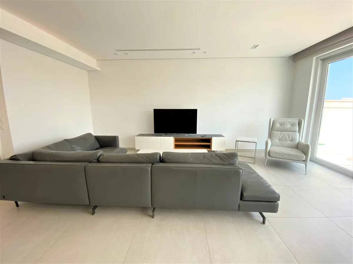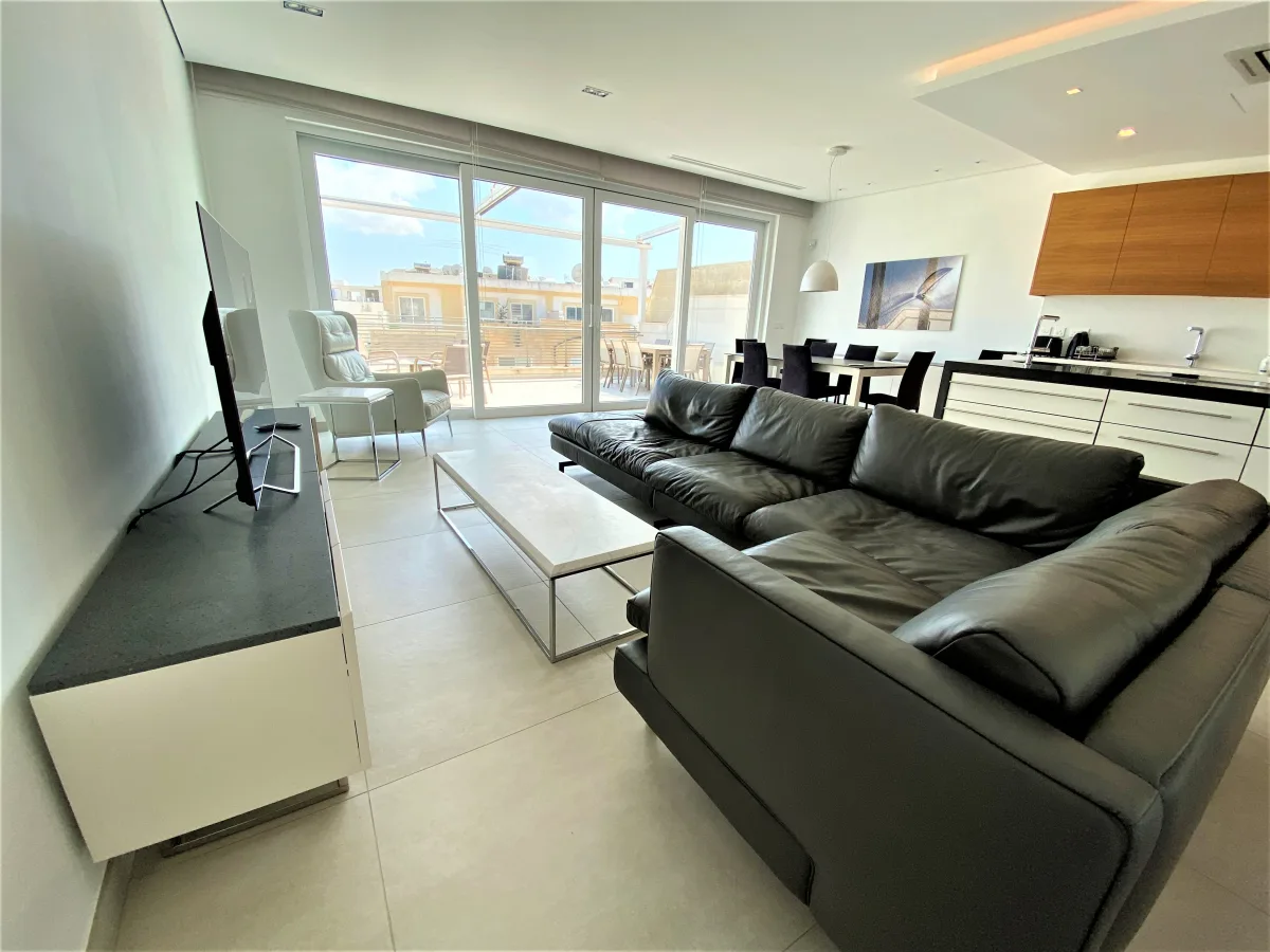 From the living area, large glass sliding doors lead to a spacious terrace, a perfect spot to unwind with a morning coffee, host al fresco dinners, or simply soak up the Mediterranean sun.