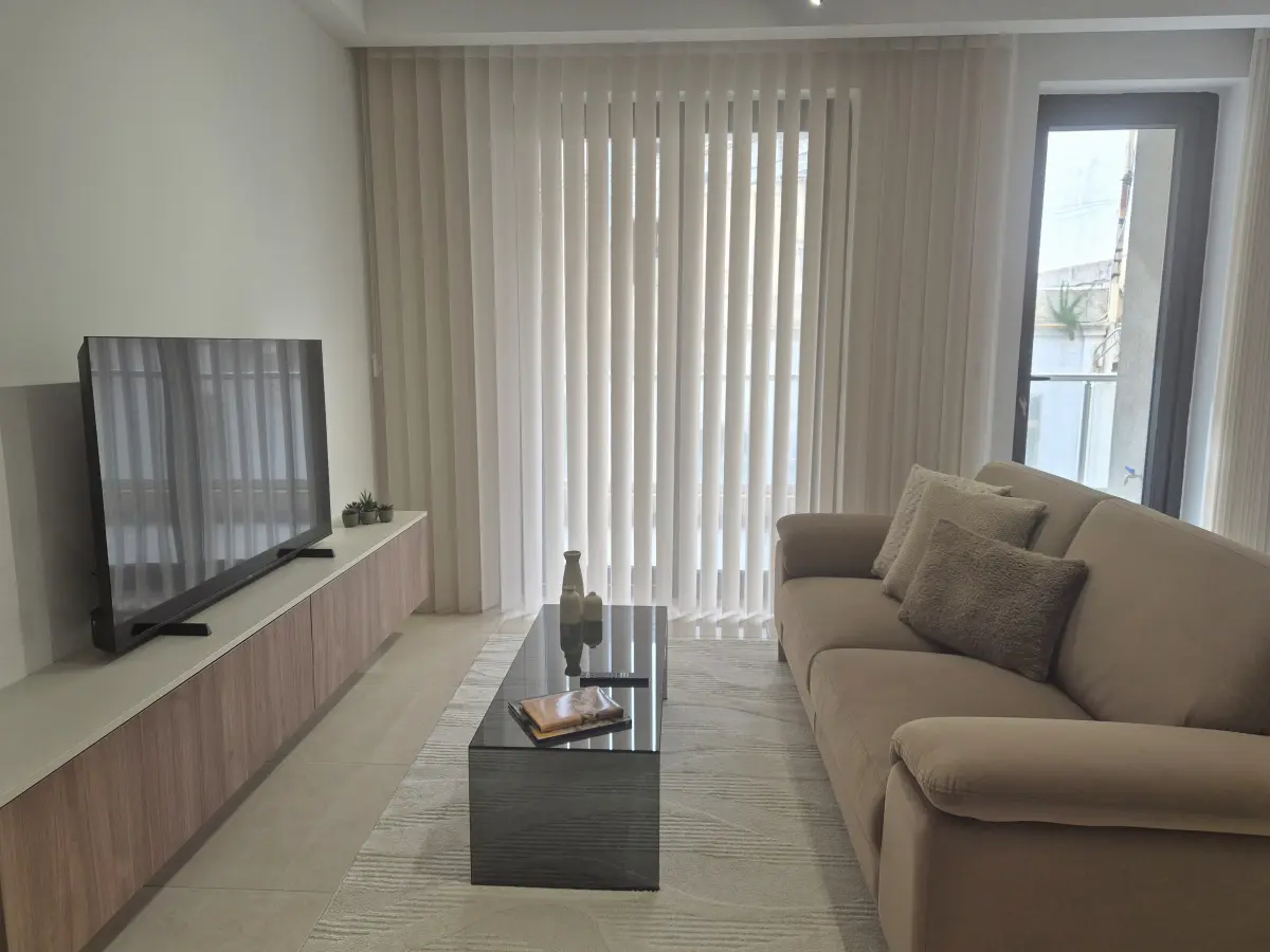 The sleeping quarters consist of two bedrooms: a twin bedroom and a double bedroom with an en-suite bathroom. A separate guest bathroom serves the rest of the apartment.