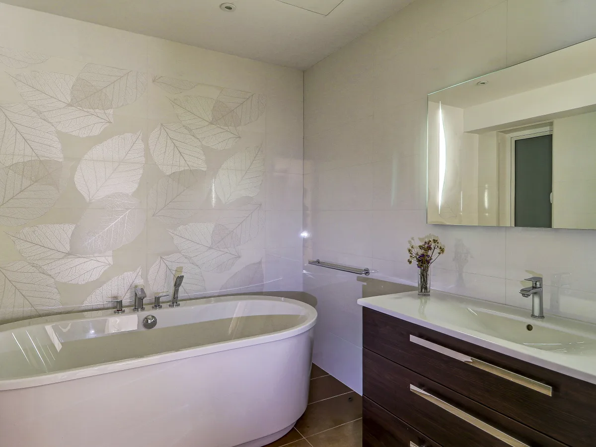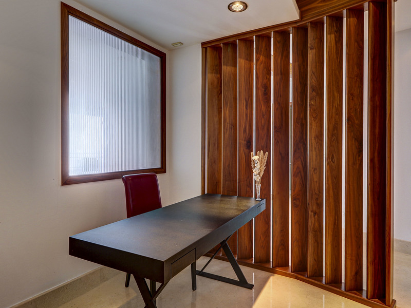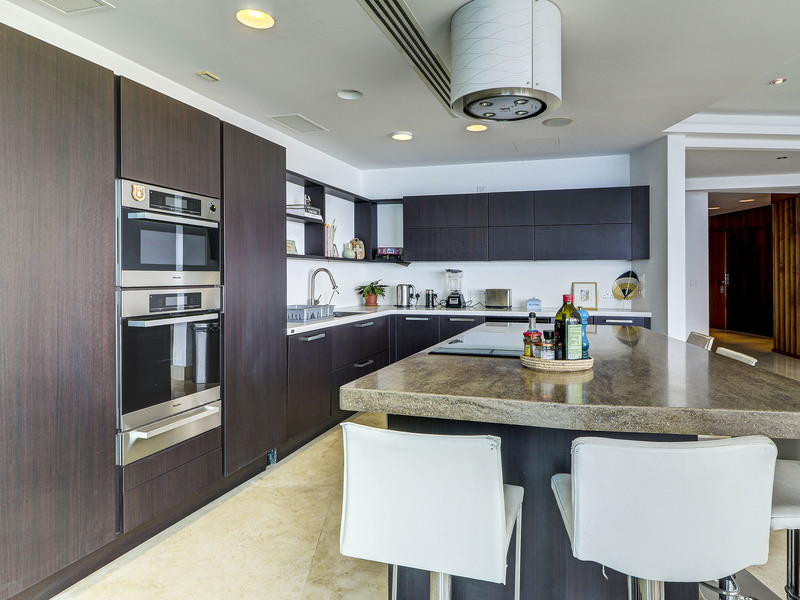 The apartment includes a guest toilet, a separate living room with a built-in study area, and thoughtfully designed sleeping quarters. There are two double bedrooms, both with en-suite bathrooms. The master suite is a true retreat, featuring a large walk-in wardrobe, a dedicated study space, and two separate bathrooms, one with a walk-in shower and another with a bathtub.
