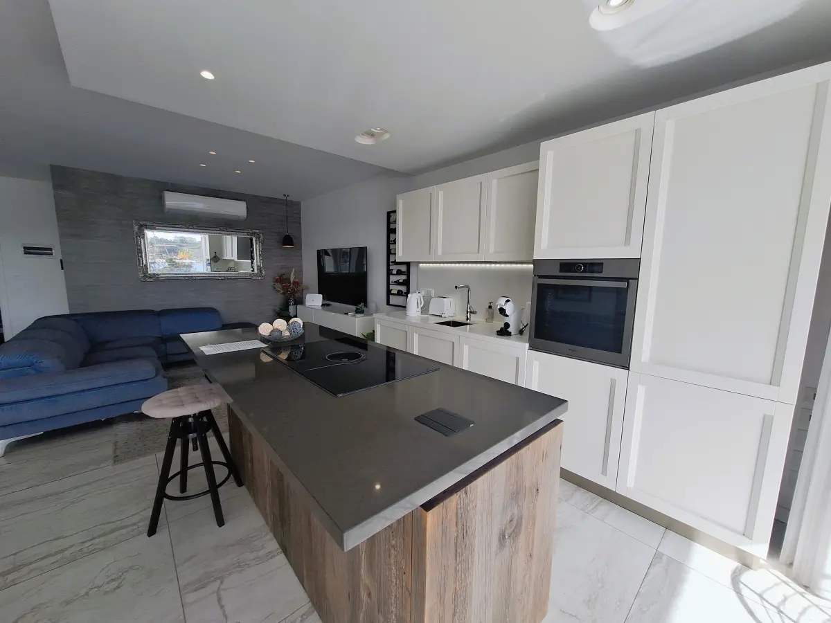 The property features a spacious open-plan fully equipped kitchen with high-end appliances, living, and dining area opening onto a generous sea facing balcony, ideal for entertaining. Going down the corridor, one finds two double bedrooms, the master with en-suite and a second bathroom finished with elegant modern fixtures.