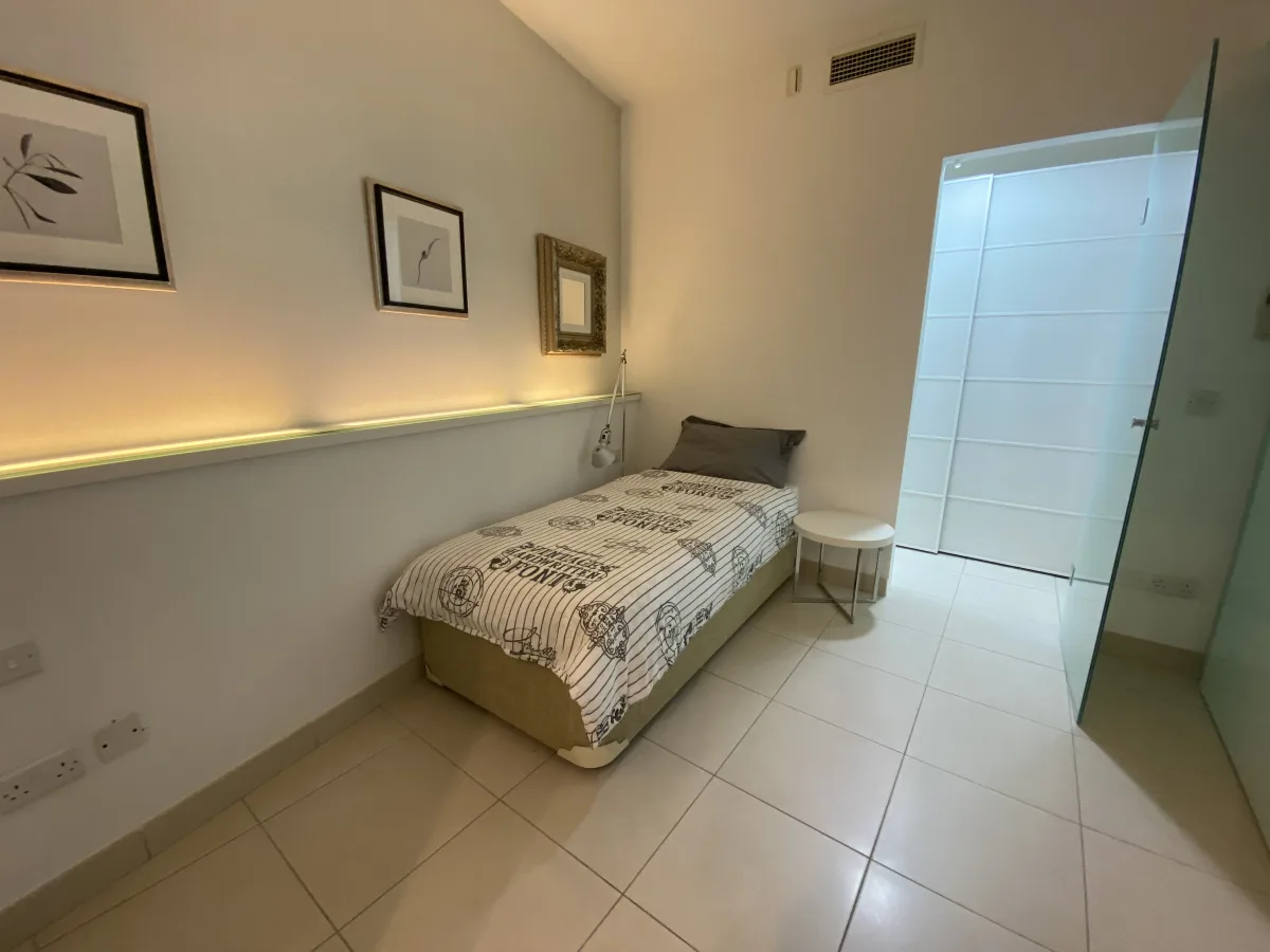 Ascending to the upper level reveals a luxurious main bedroom featuring an en-suite shower and bath, a private balcony, a spacious walk-in wardrobe, and a dedicated laundry room. The property comes fully furnished and is equipped with comprehensive air-conditioning and heating.