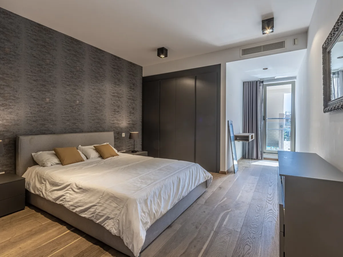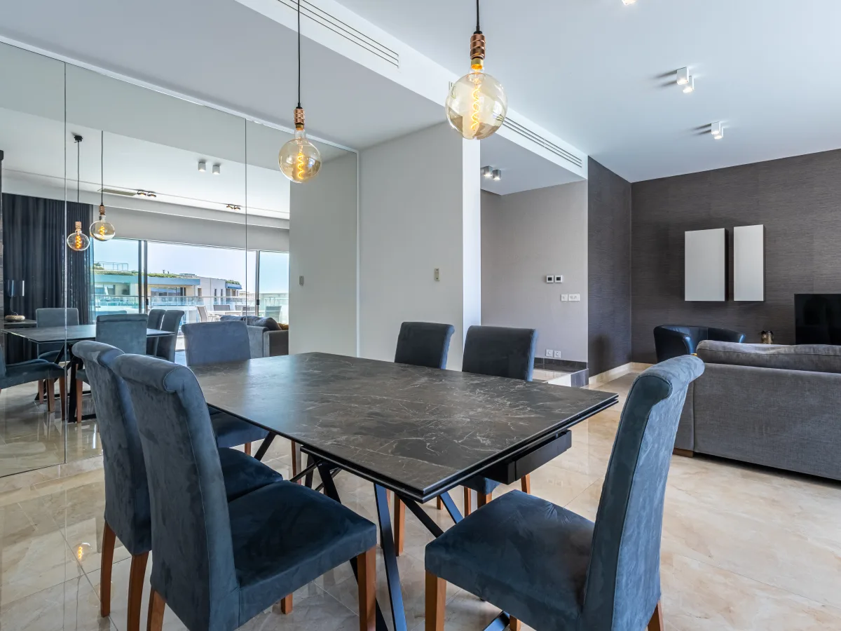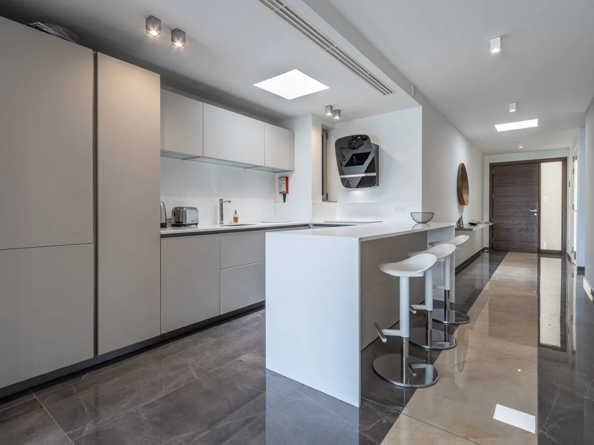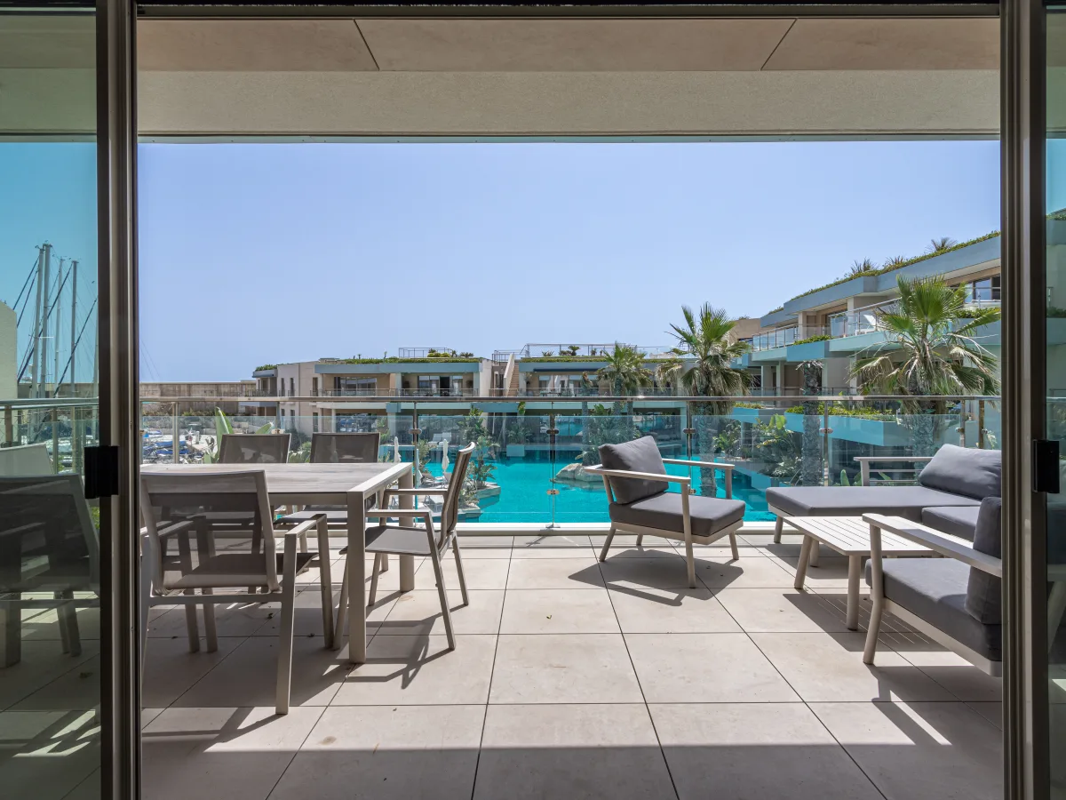 Set on the second floor the layout comprises a welcoming entrance hall, washroom and guest WC, a modern fitted and fully equipped kitchen, which leads onto a bright and airy spacious open plan living and dining area opening onto an 18 sqm front terrace overlooking the Laguna, perfect for sundowners and outdoor entertaining. The sleeping quarters comprise two double bedrooms both with en-suite facilities. Other amenities include Parquet flooring in bedrooms and underfloor heating throughout, gypsum soffiting, and concealed air-conditioning. Also included is a 1 car space. Ideal for a couple