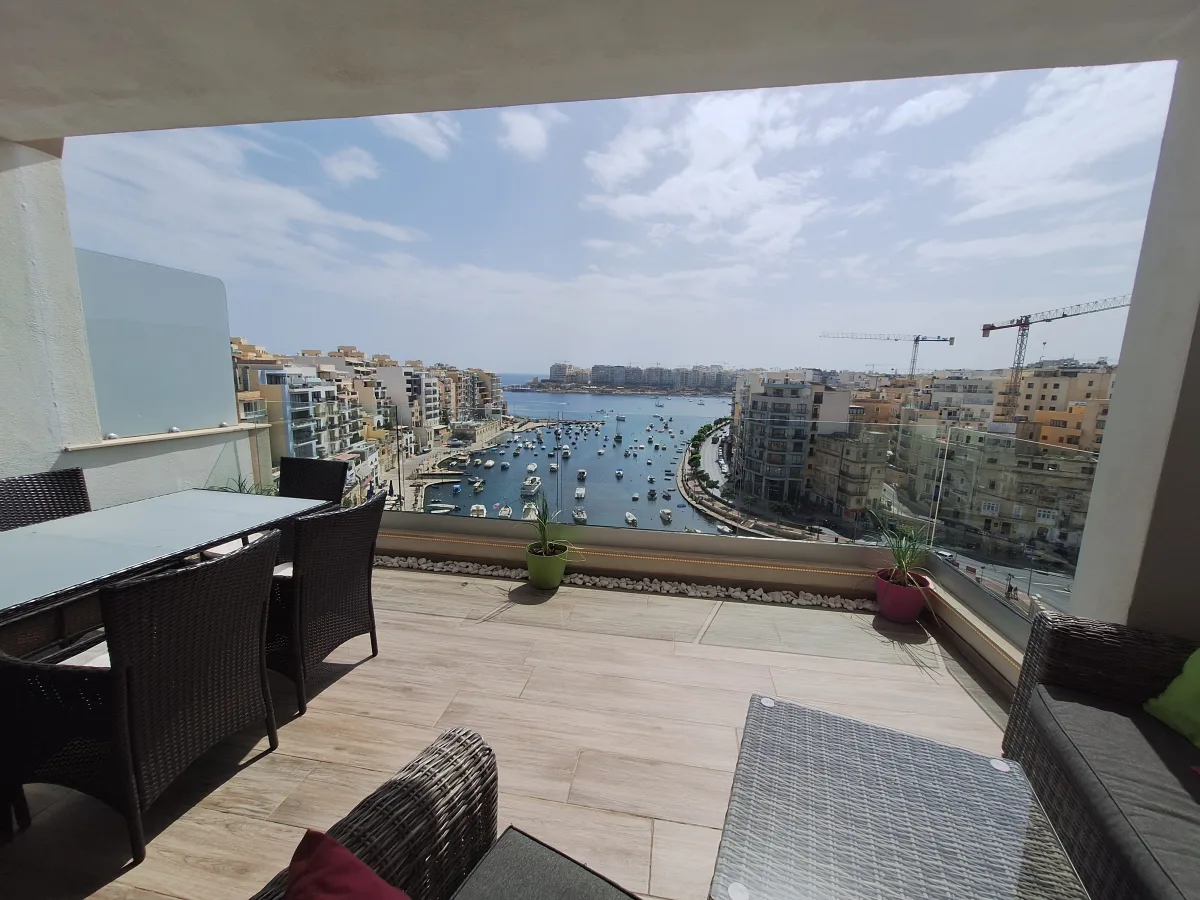 The highlight of this home is the expansive terrace, providing an unobstructed view of the serene bay, a perfect spot for relaxing or entertaining. Inside, the apartment features an open-plan layout that seamlessly connects the living room, dining area, and kitchen, creating a spacious and inviting atmosphere. The property includes two generous double bedrooms, with the master bedroom boasting an en-suite bathroom for added privacy and convenience. A separate washroom is also available.
