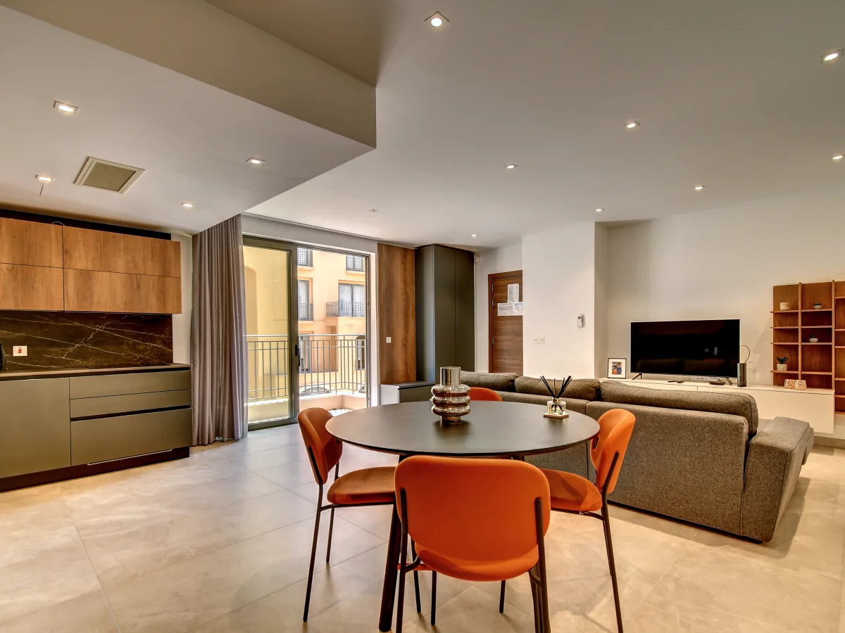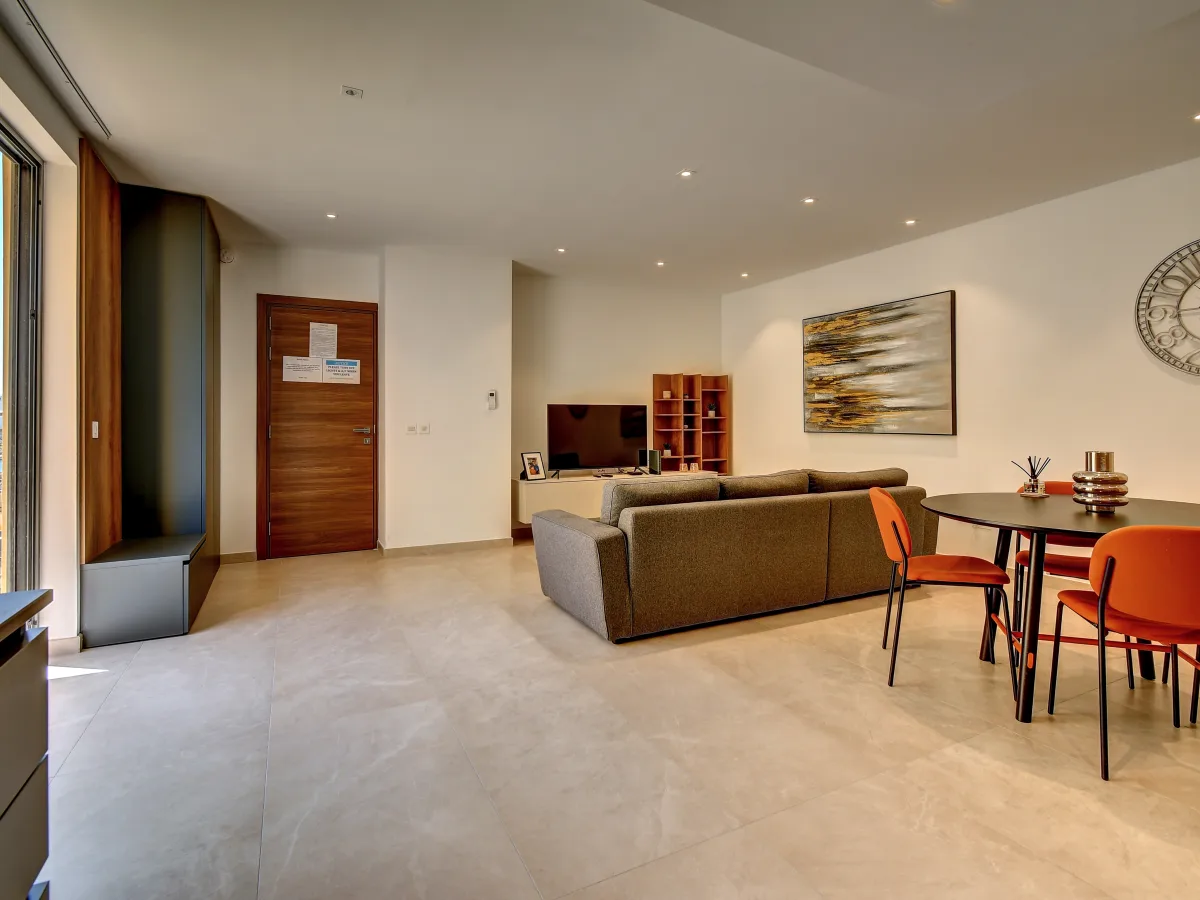 This apartment, sitting on a footprint of circa 100sqm enjoys an attractive layout with a lovely open plan living room and dining area which opens up onto a terrace overlooking the city scape and the beautiful waters of the azure sea. A fully equipped kitchen is well positioned within this spacious front room to enjoy the views from the front terrace, which bathes the property in natural light.
