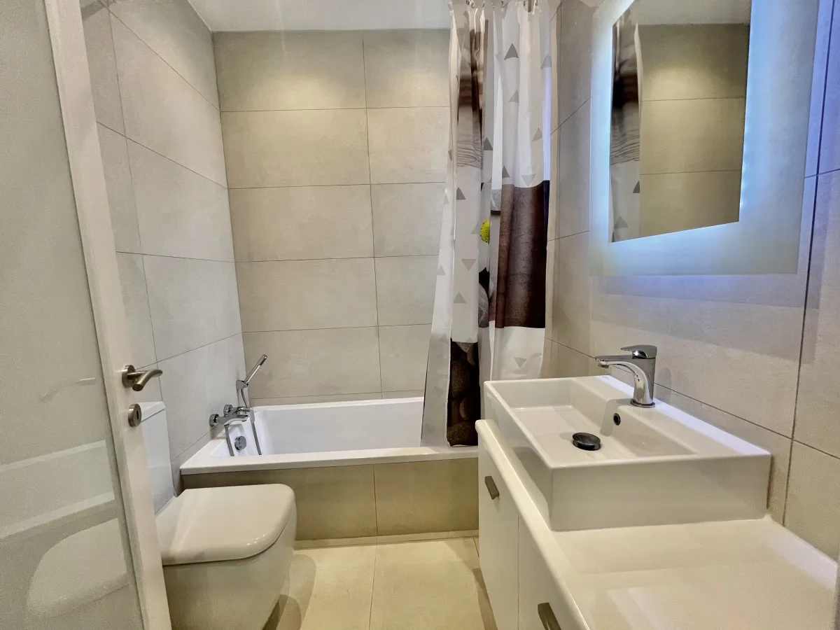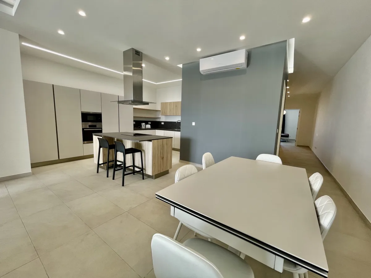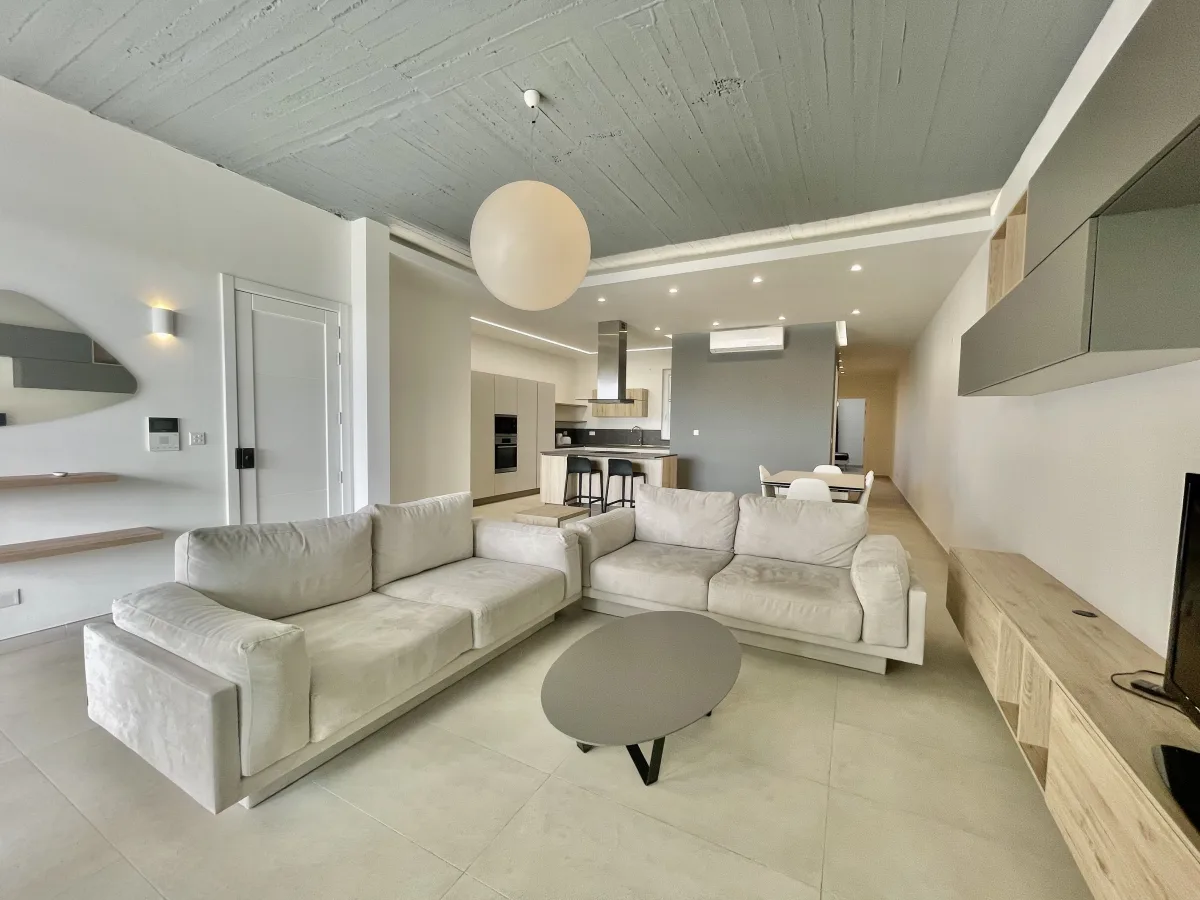 Upon entering, the apartment welcomes you with an abundance of natural light, due to its South-facing orientation, which creates an inviting ambiance throughout. The open plan kitchen, living, and dining area provide a seamless flow, leading out onto a sizable front terrace, an ideal space for alfresco dining or simply enjoying the sunshine. Two well appointed double bedrooms, providing comfortable accommodation for residents and guests alike. The main bedroom boasts an en-suite bathroom for added convenience, while a second bathroom serves the needs of the home. Additional amenities include a dedicated laundry room and an office area, offering practical solutions for everyday living. The property is offered fully furnished and equipped with modern conveniences.