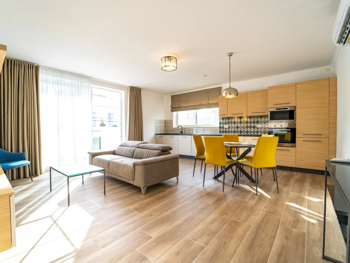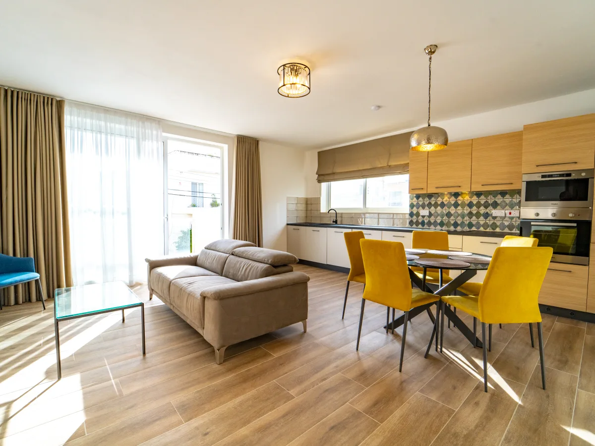 The apartment has never before been occupied. It has a practical, modern and stylish interior, with Italian & German furnishings and consists of two double bedrooms ,one with an en-suite WC, one bathroom with a walk-in shower, as well as a spacious living area, comprising lounge, dining and kitchen. The bedrooms and living areas are equipped with air-conditioning, with well-known high-quality brands of TV, dishwasher, washing machine/tumble dryer, microwave oven and fridge-freezer are installed in the apartment.