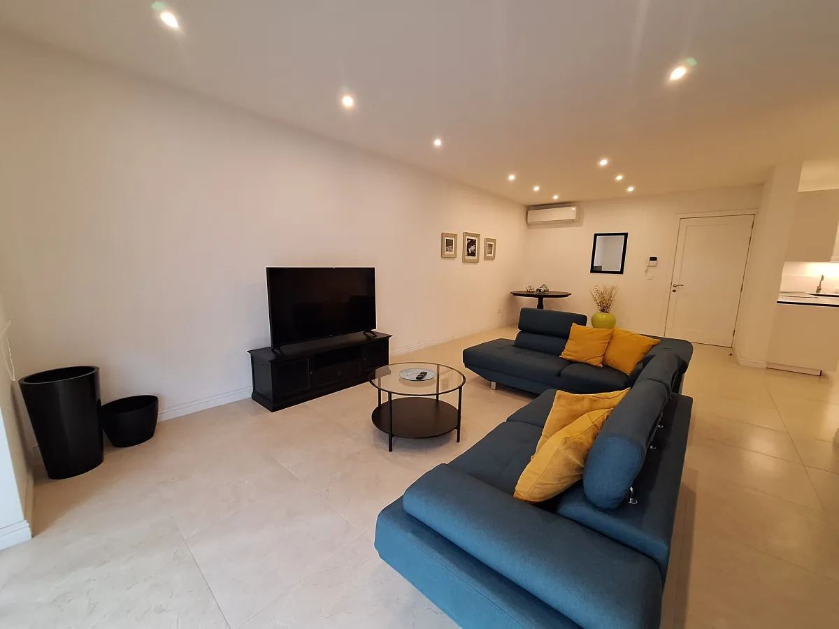 The spacious open plan living, dining, and TV area leads onto an impressive 11metre terrace, beautifully furnished for outdoor relaxation and entertaining. The distinctive kitchen is fully equipped with high-quality appliances, designed with both practicality and elegance in mind.