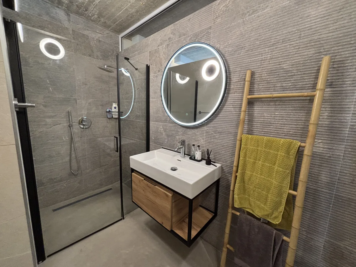 The property includes one well-sized bedroom and two modern bathrooms that consist of shower, WC, and washbasin. A large basement filled with natural light provides an ideal space for a second bedroom, laundry area, home office, or creative workstation.