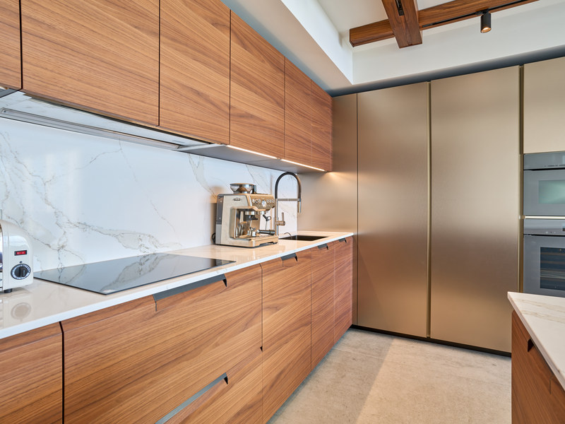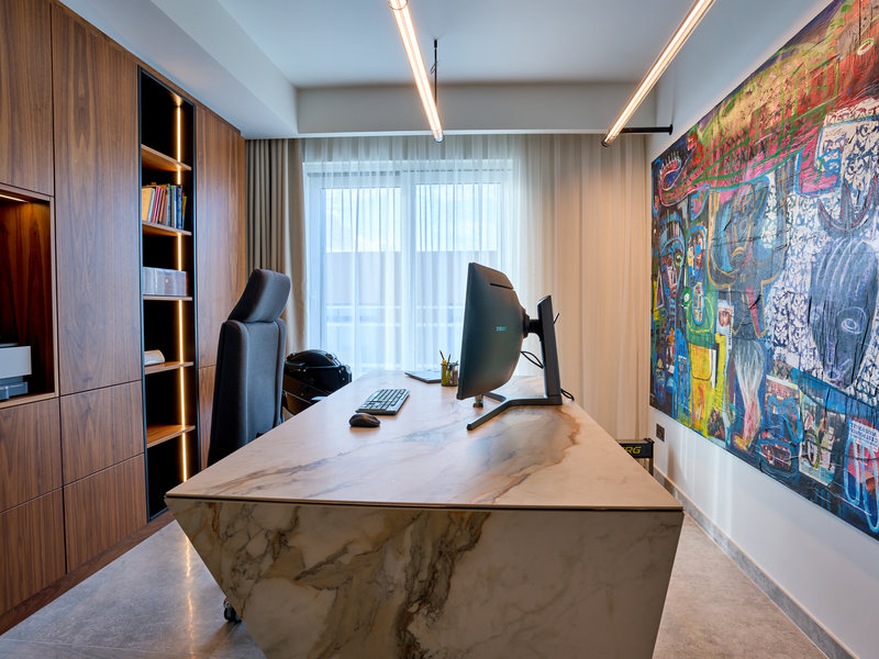 The home offers two elegant bedrooms, including a tranquil master suite with a walk-in wardrobe and en-suite bathroom, a stylish main bathroom, and a fully equipped home office with glass doors for privacy and inspiration. Each element, from the lighting to the finishes, has been thoughtfully curated to balance comfort, elegance, and modern living.