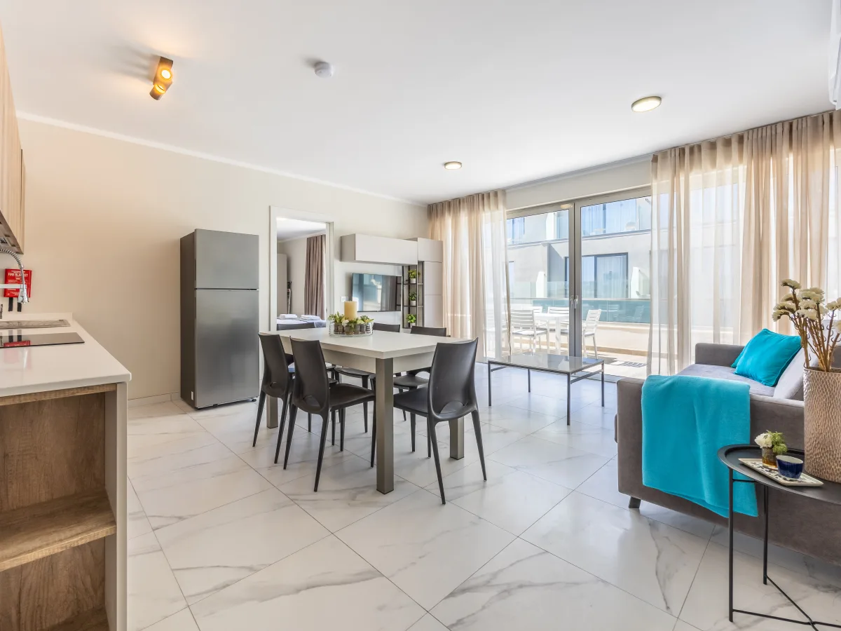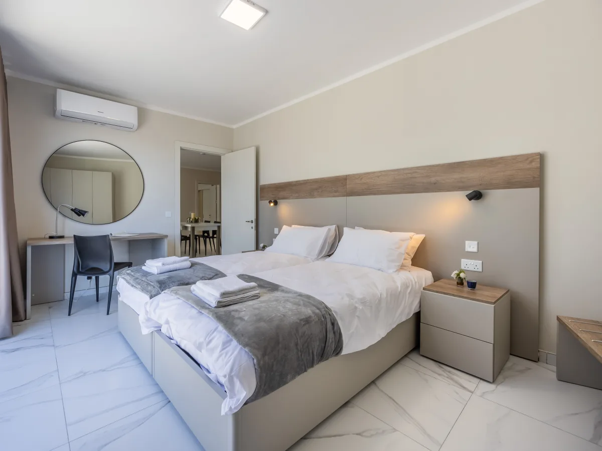 Both bedrooms enjoy direct access to the terrace, allowing for gentle sea breezes and a strong connection to the outdoors. The main bedroom features a private en-suite bathroom and an additional single bed, offering flexible sleeping arrangements ideal for families or guests. A separate main bathroom completes the layout, combining functionality with contemporary style.