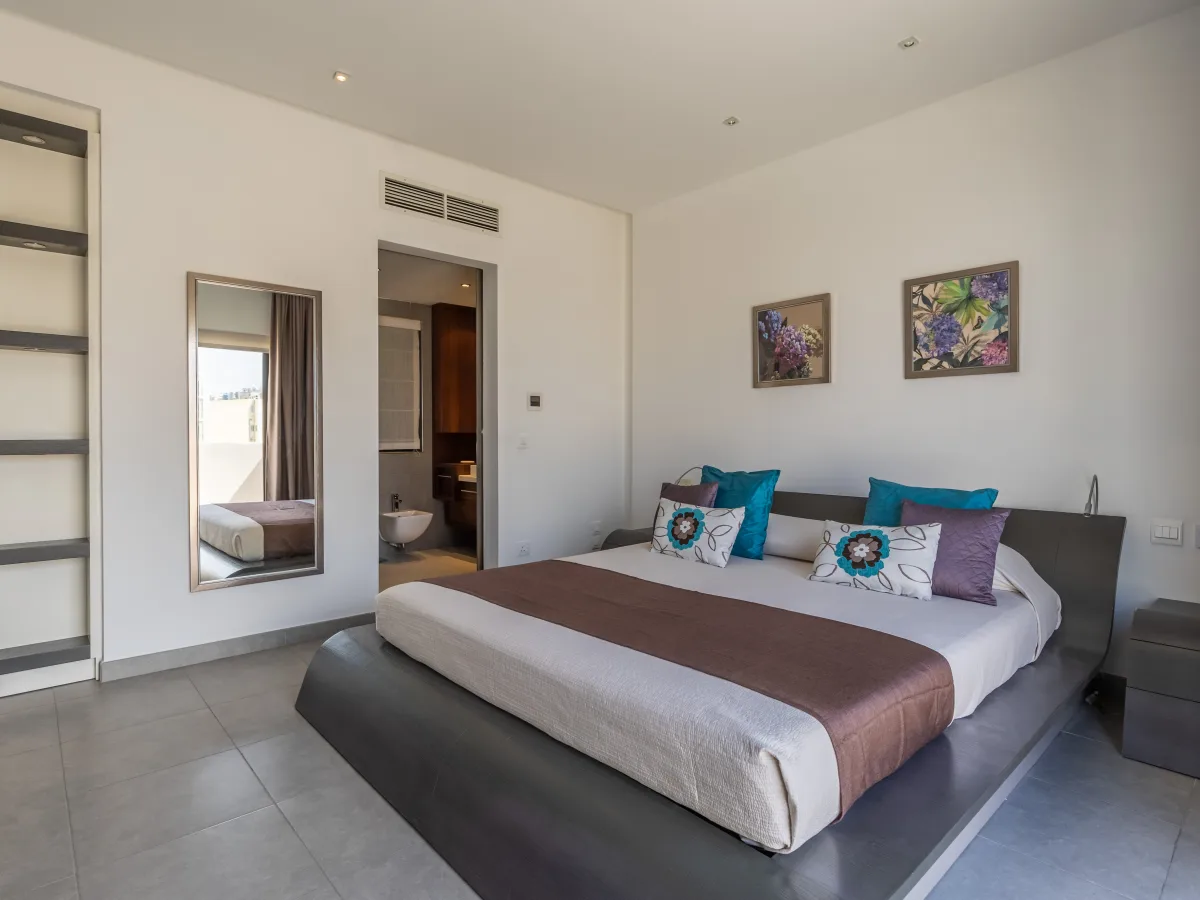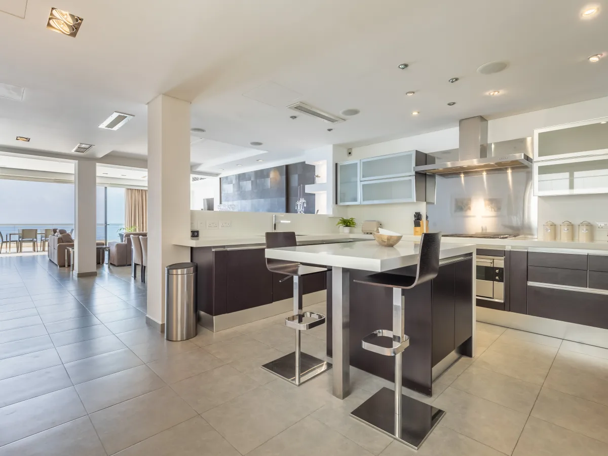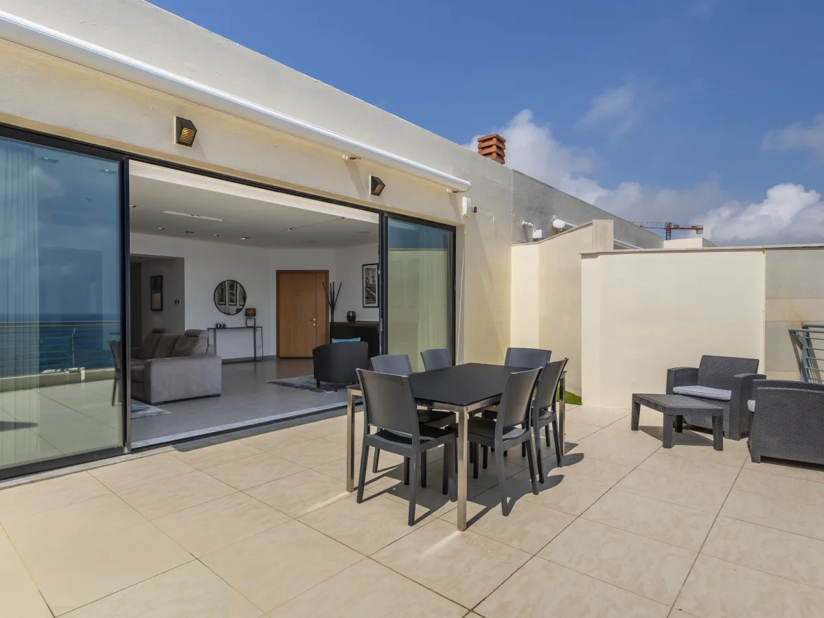 Set on 300 sqm, the property comprises a formal living room with a breathtaking panorama of the sparkling sea and immense blue sky, a very pleasant dining area, a cloak room, a guest toilet, a fitted kitchen equipped with built-in quality appliances, and plenty of work surfaces. The sleeping quarters can be divided with a sliding door, and consists of two double bedrooms both with en-suite, an impressive walk-in wardrobe with ample storage space and a well sized utility room.