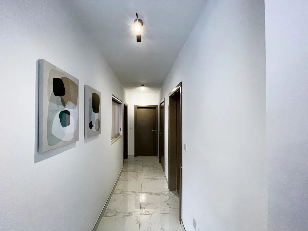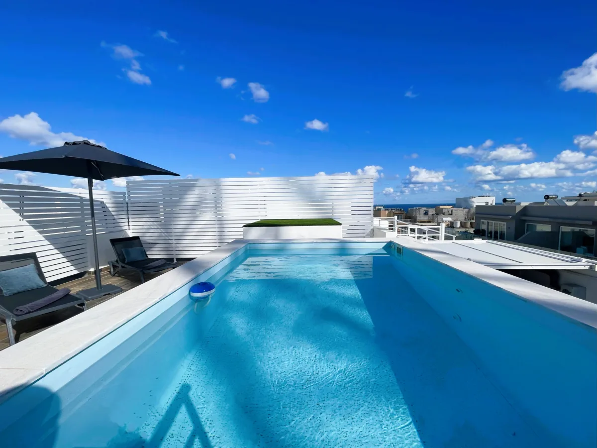 The open plan layout comprises of a kitchen, a comfortable living area, and a dining space, all of which flow onto a spacious front terrace. This outdoor area is perfect for al fresco dining and entertaining, providing a seamless connection between indoor and outdoor living. From the main terrace, a stylish spiral staircase ascends to an upper level, where one will find a private swimming pool and sun lounging area, ideal for enjoying the Maltese sun.