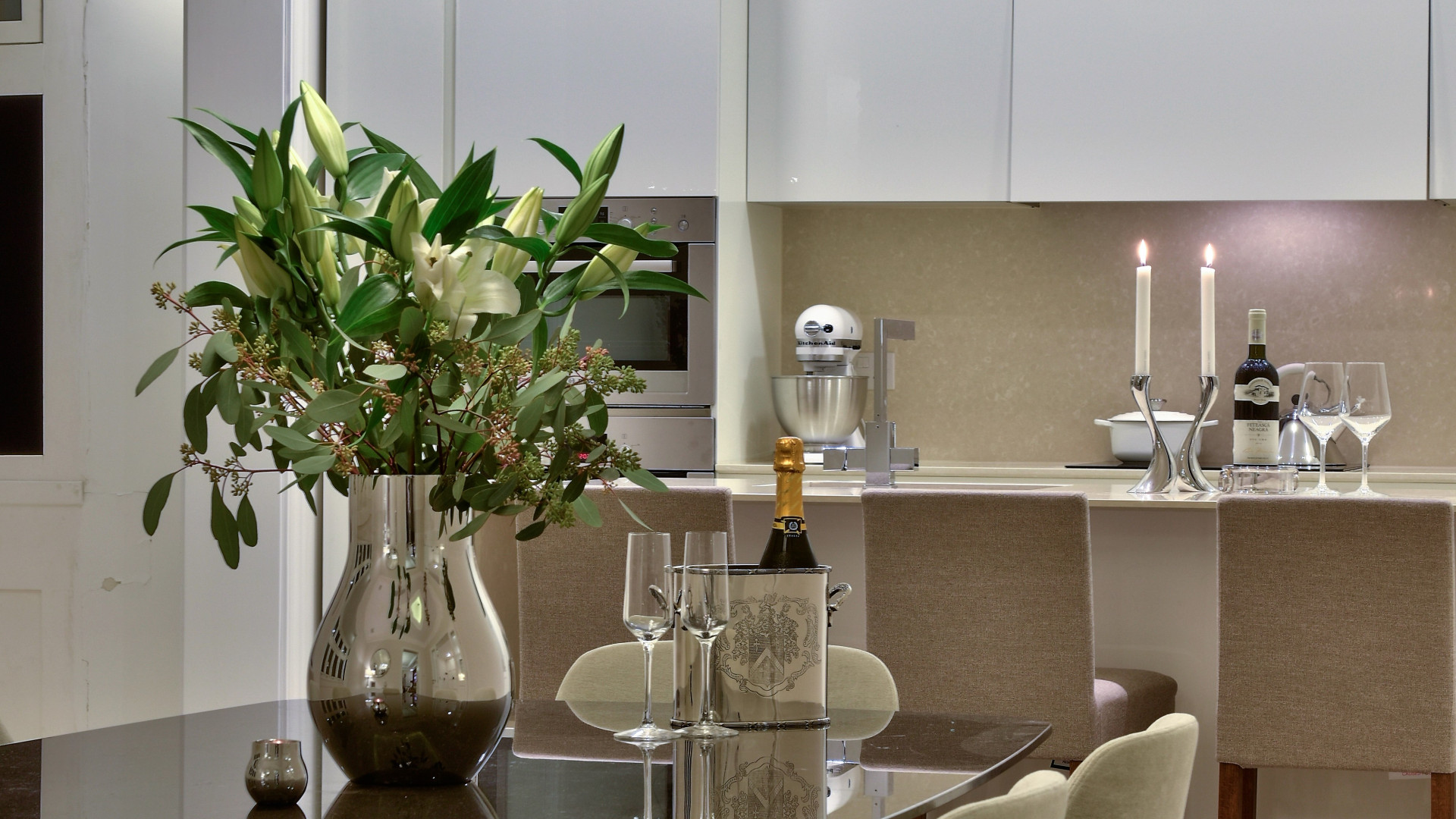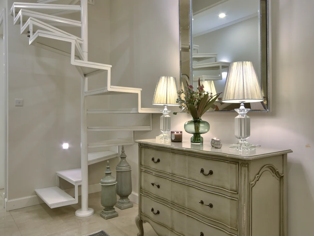 A spiral staircase leads to a converted roof room—a versatile space that can serve as a third bedroom, study, gym, or other purpose—accompanied by its own shower room.