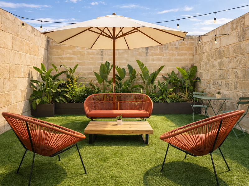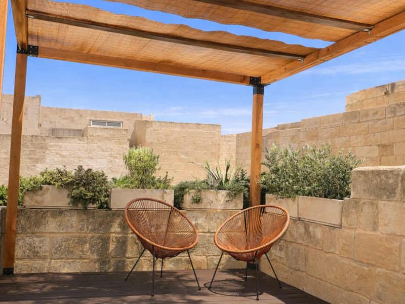 At roof level, a lovely roof garden with a canopy creates the perfect setting for outdoor entertaining or relaxation. The home is being sold fully furnished and equipped, including appliances, air conditioning, and a reverse osmosis system, ensuring immediate comfort and convenience.