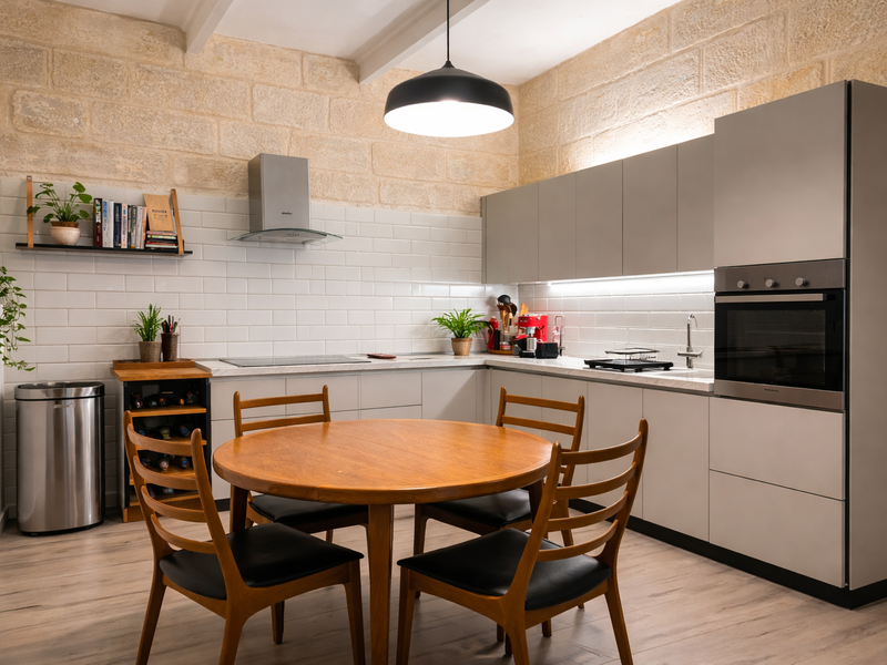 The property offers a well-balanced layout, featuring two entrances, an open plan kitchen, living and dining area, two bedrooms, and two bathrooms. It further benefits from an internal courtyard, a dedicated washroom, and an additional box room, providing practical and versatile spaces throughout.