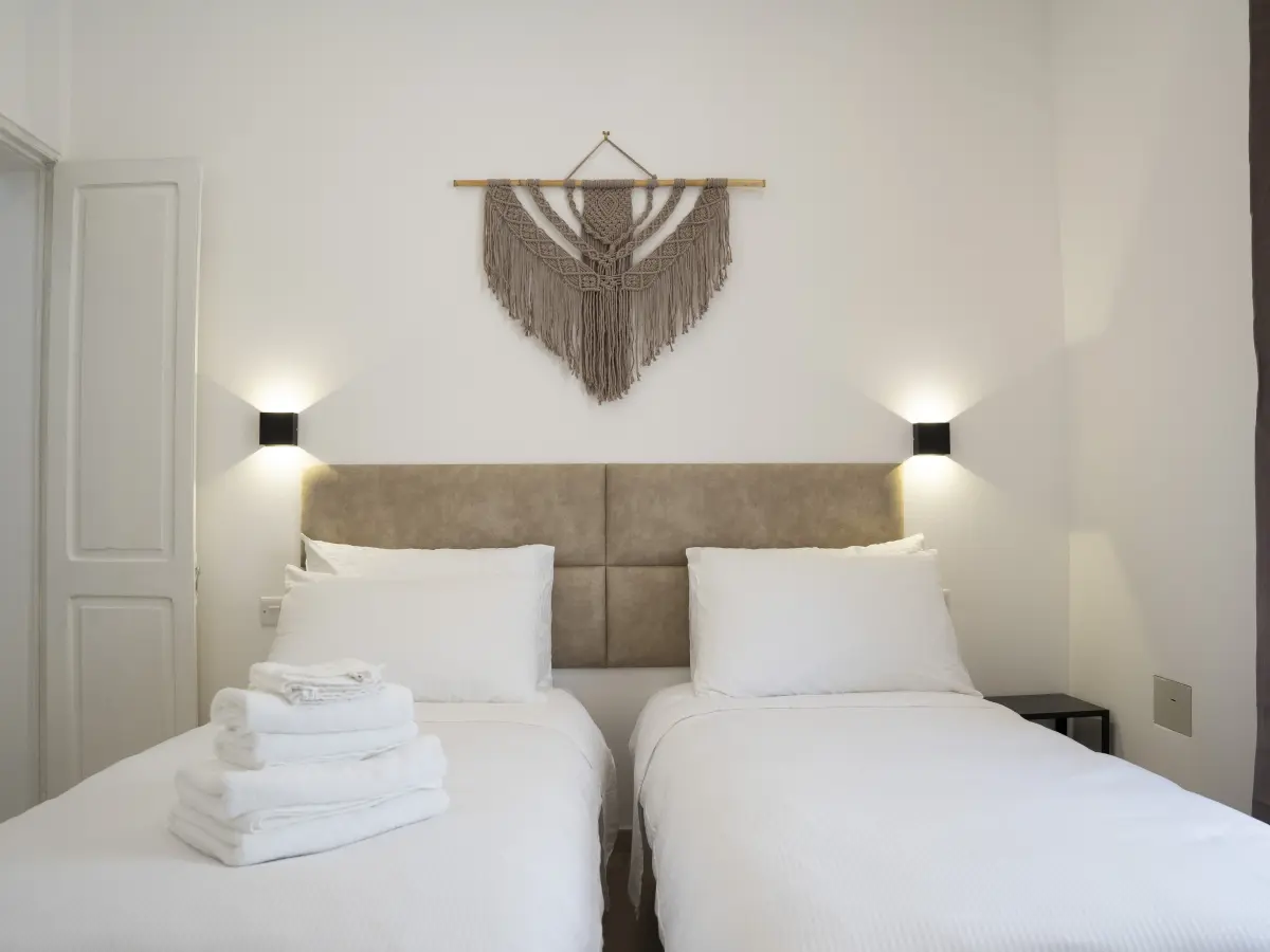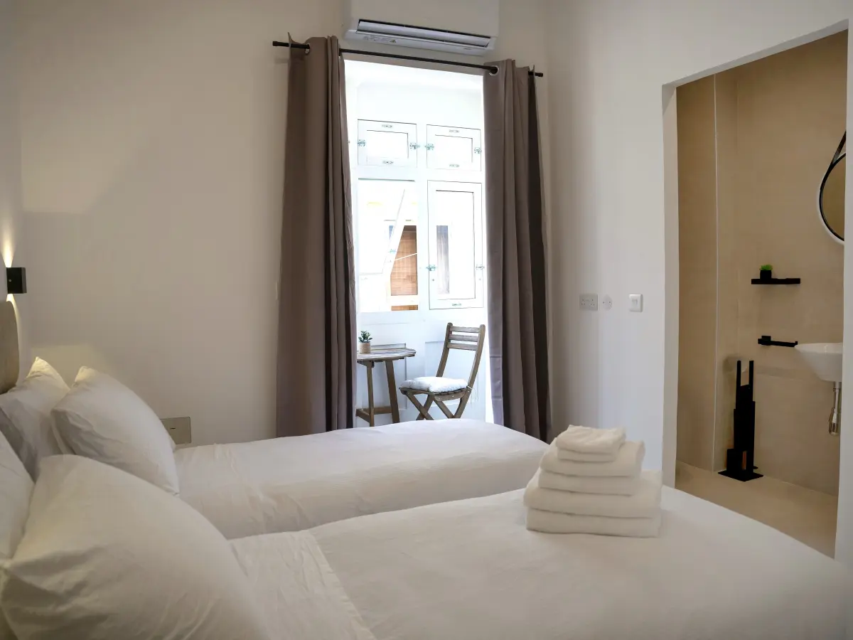 Upon entrance, one is welcomed by a modern living and dining area and a fully equipped kitchen including dishwasher, electric hob, oven and fridge,freezer. On the first floor, one finds the first bedroom which consist of a double bed, ensuite bathroom and an open balcony. On the second floor, one finds the second bedroom which consists of two single beds which can be joined together to make a double bed, an en-suite bathroom and a Maltese balcony. At roof level, one finds a kitchenette area complete with mini fridge, washing machine and tumble dryer and a comfortable sunlit terrace. Here one can also watch the sunset and fireworks with views stretching out to Valletta, while enjoying drinks and nibbles.