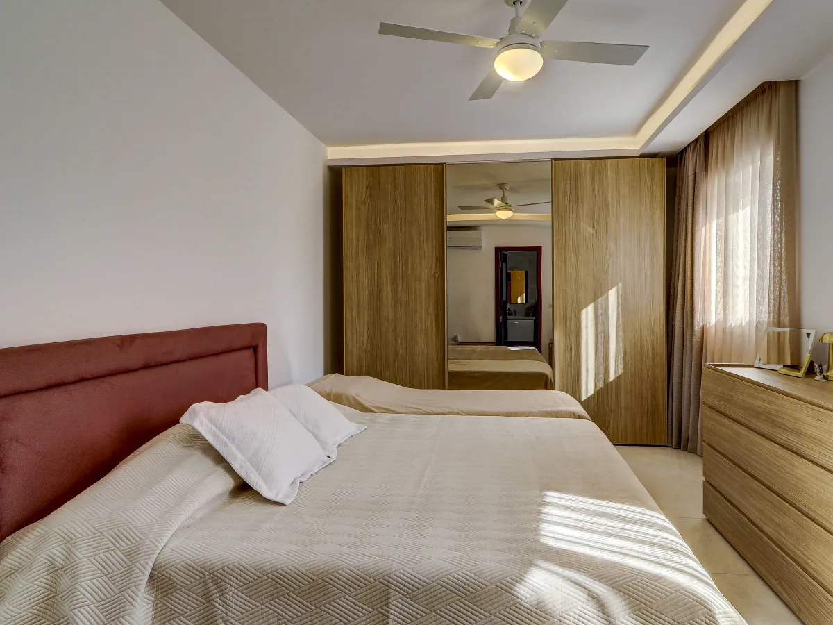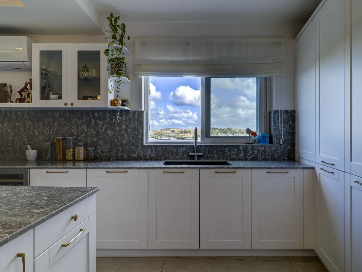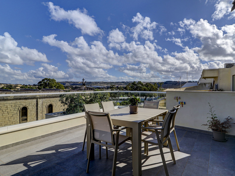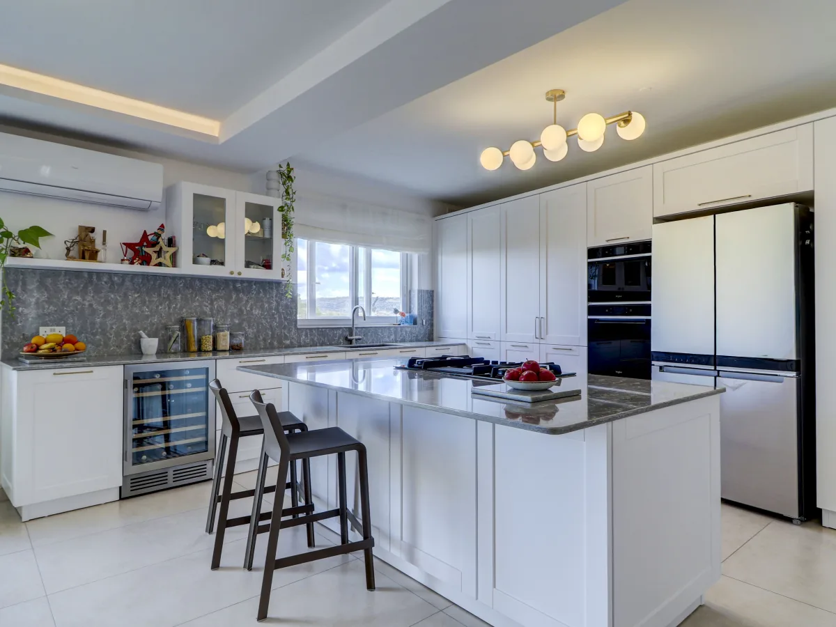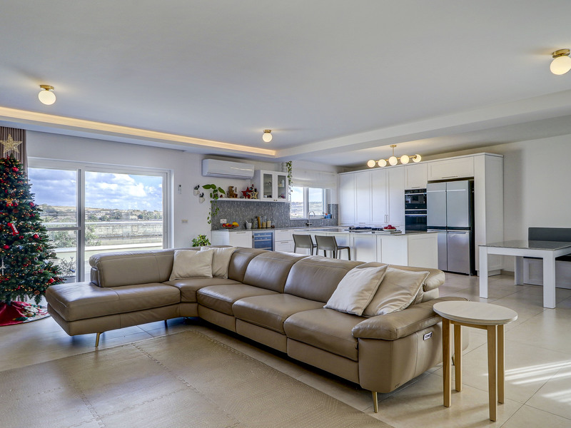 The property features three spacious bedrooms, each with its own en-suite bathroom, and a guest bathroom for added convenience. A separate laundry room enhances practicality, while the heart of the home is the expansive open-plan kitchen, dining, and living area measuring an impressive 65 sqm. Large sliding doors open onto a 25sqm terrace, perfect for outdoor dining or relaxation, offering unobstructed views of the quaint Burmarrad chapel, open countryside, and distant sea vistas.