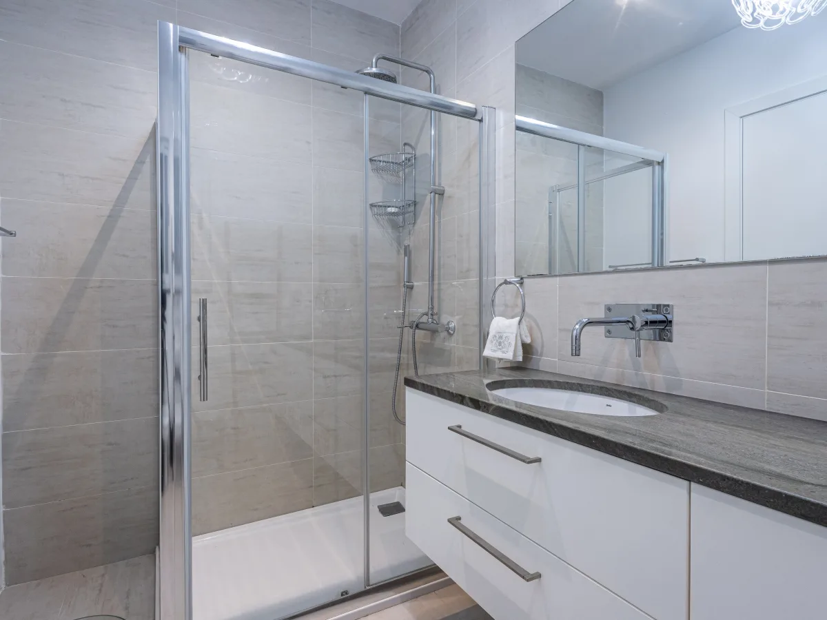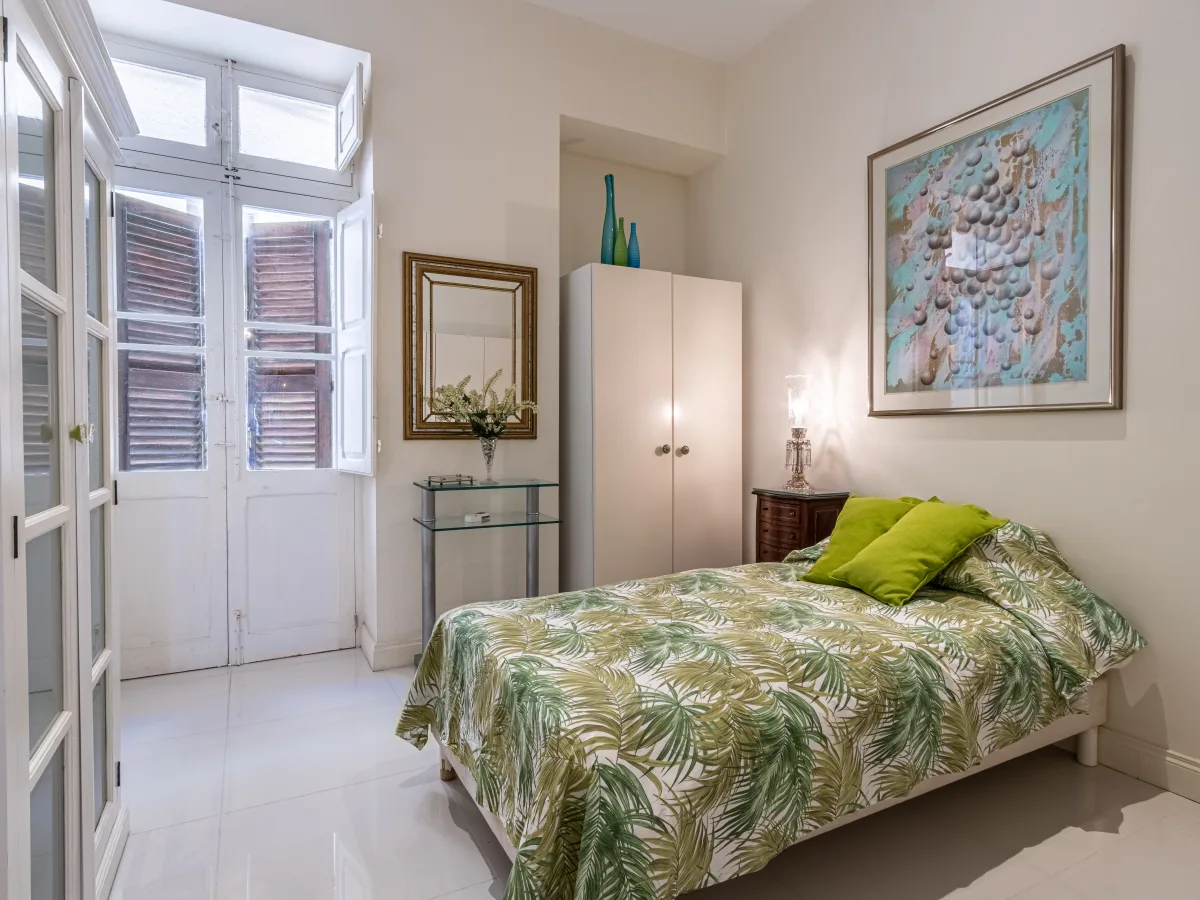 The master bedroom, adorned with lofty apertures, basks in natural light, accompanied by a lavish bathroom boasting a standalone bath and shower. Two additional bedrooms, each with access to a back balcony, offer comfort and tranquillity and are both serviced by a convenient shower room with double sinks. Completing this lovely home is an equipped laundry facility in its own discreet closet and a storage room at roof level.