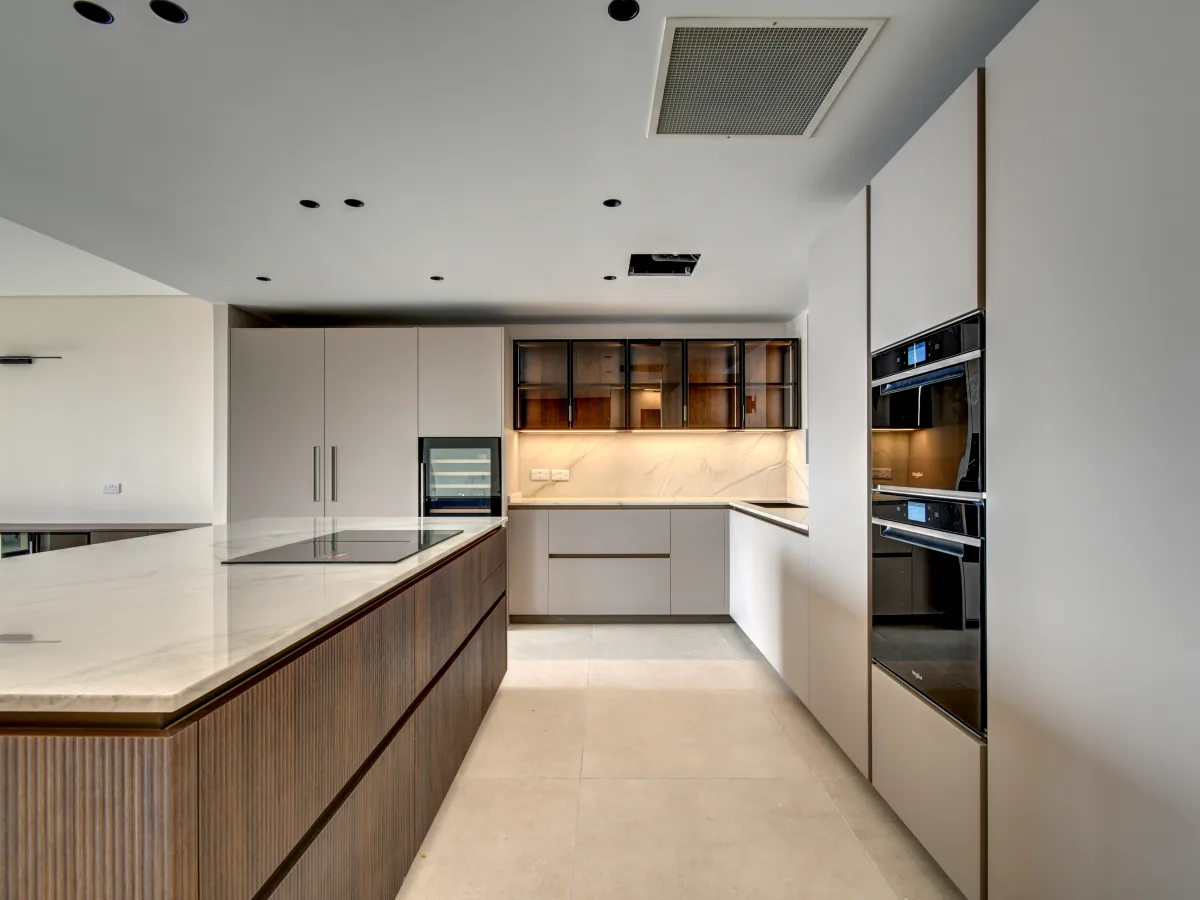 The apartment features three bedrooms ,two of which have en-suite, a guest bathroom, utility room, and an impressive open-plan kitchen, sitting and dining area that opens onto a spacious seafront terrace, perfect for entertaining, with stunning sea views throughout. Presented in immaculate condition and newly finished to an opulent standard, the apartment also includes two private parking spaces, with lift access in the underground car park.