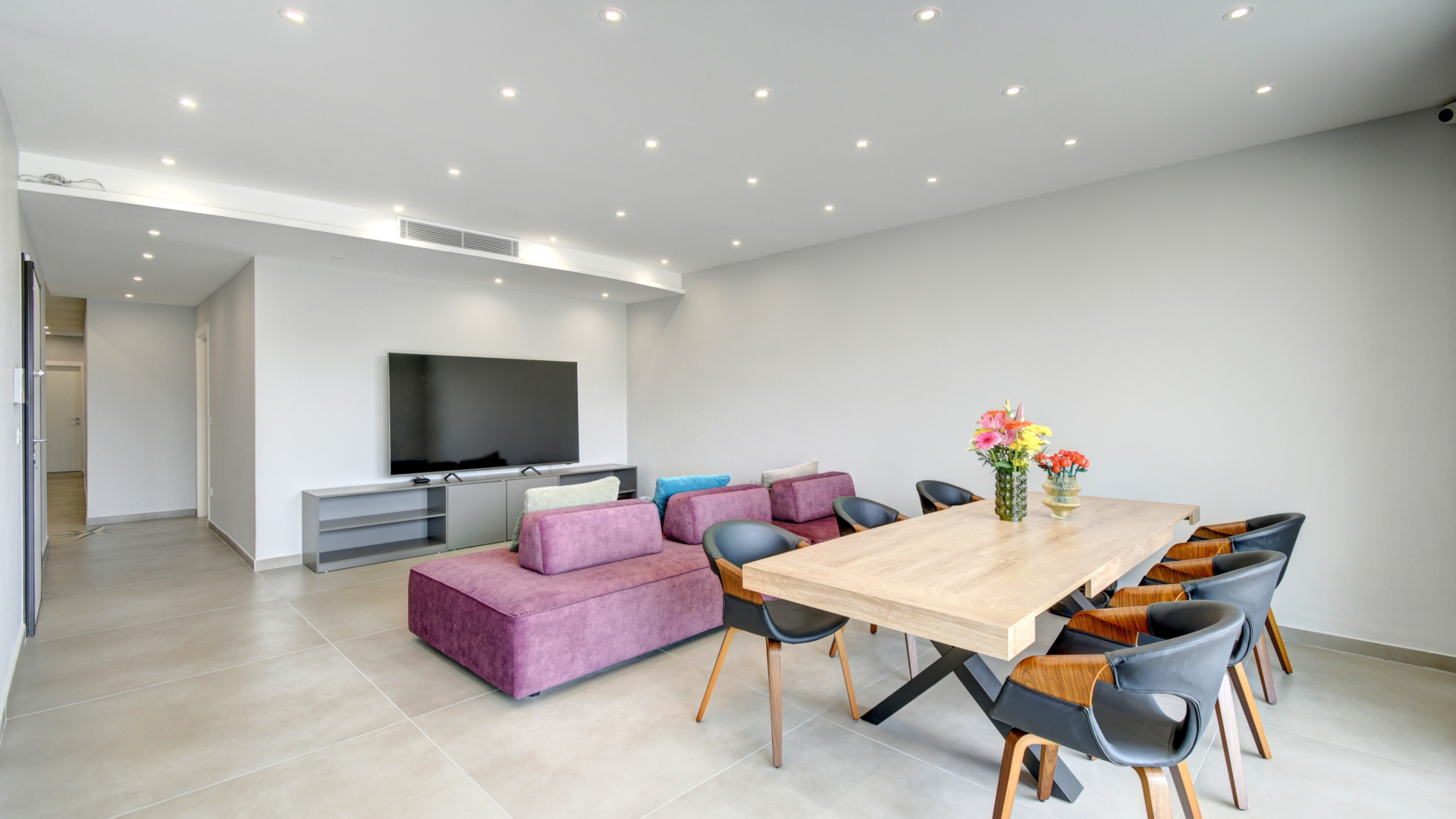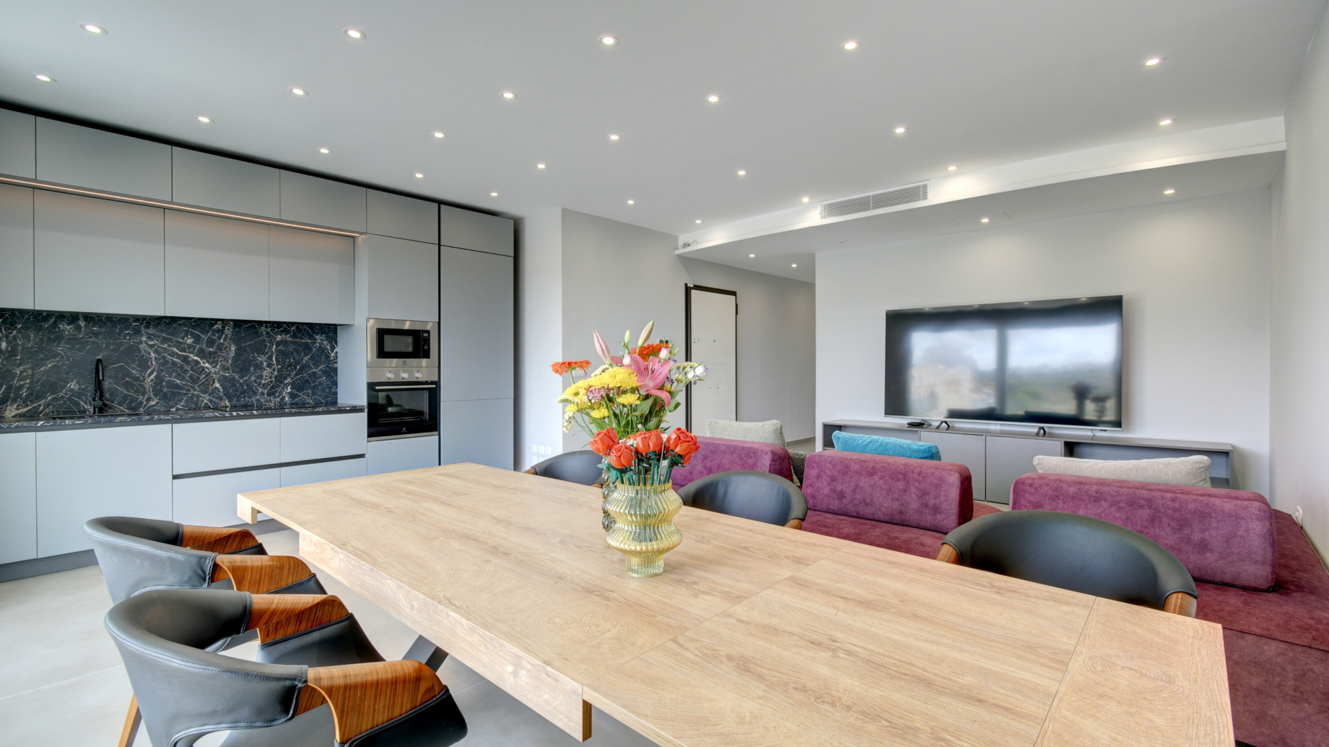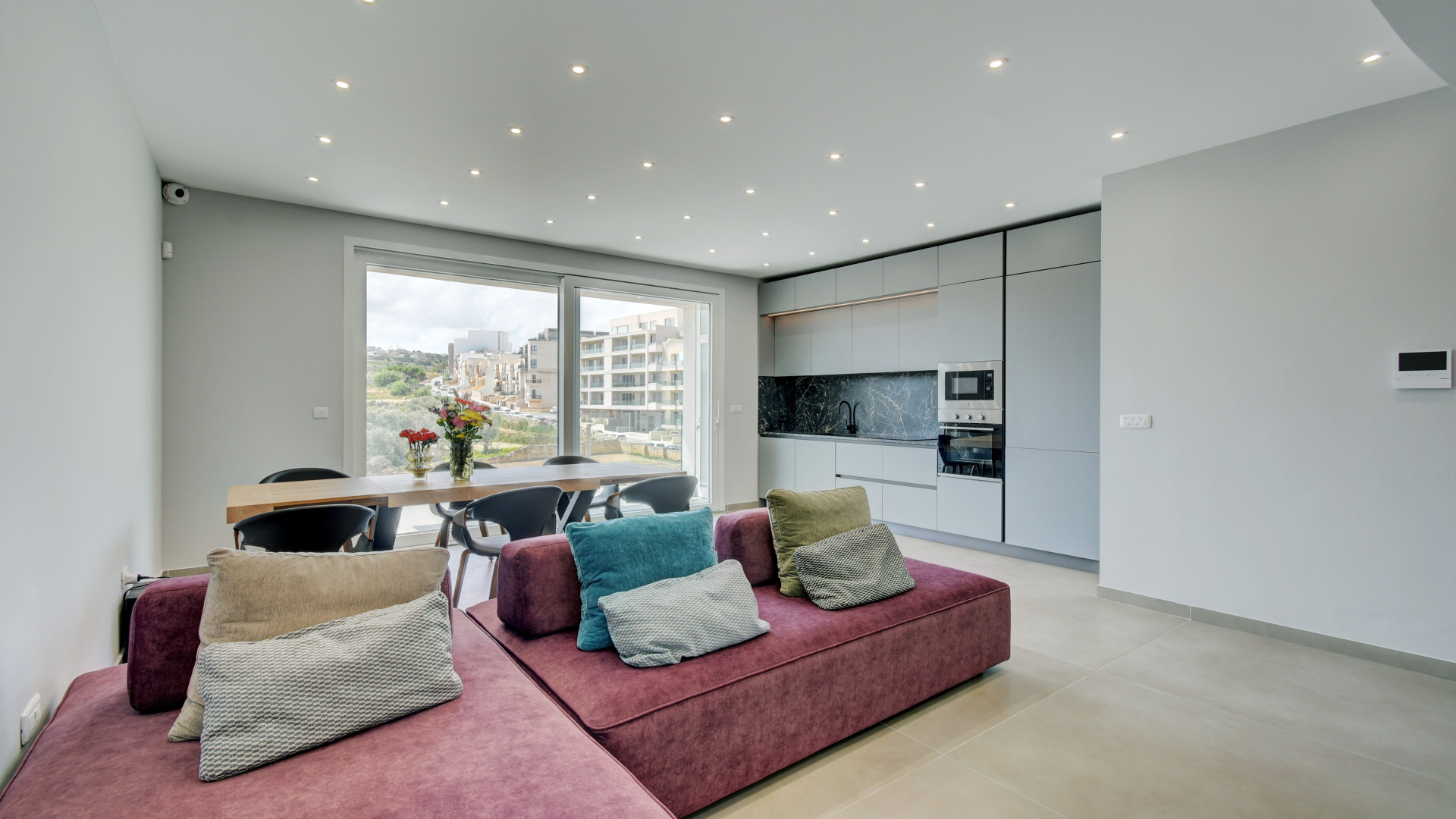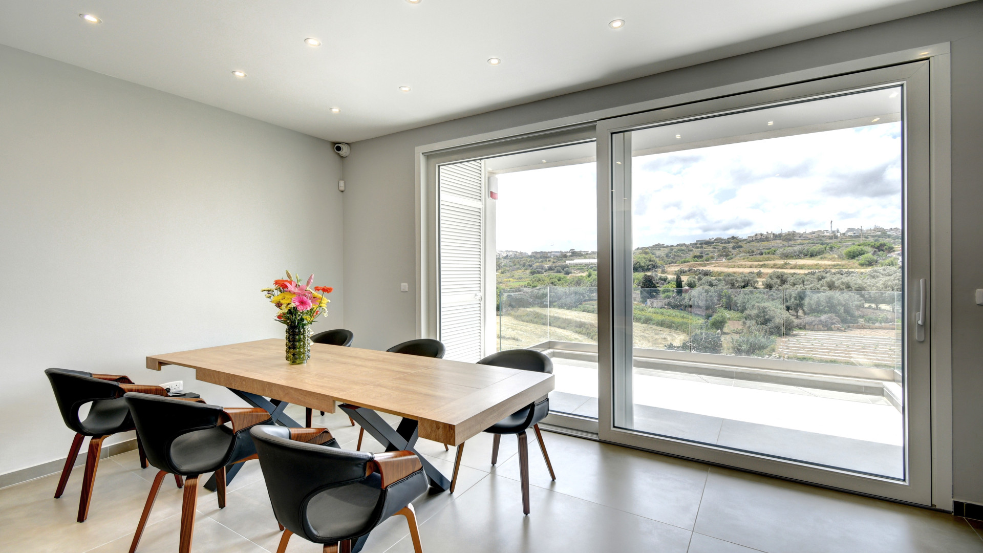 At the heart of the home is a spacious open plan kitchen, living, and dining area, finished to a high standard and fully equipped for modern living. This inviting space opens directly onto a large terrace, ideal for al fresco dining or simply relaxing while enjoying the stunning valley views.