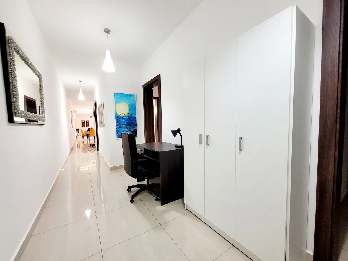 Furthermore, the apartment offers an office area with storage.
