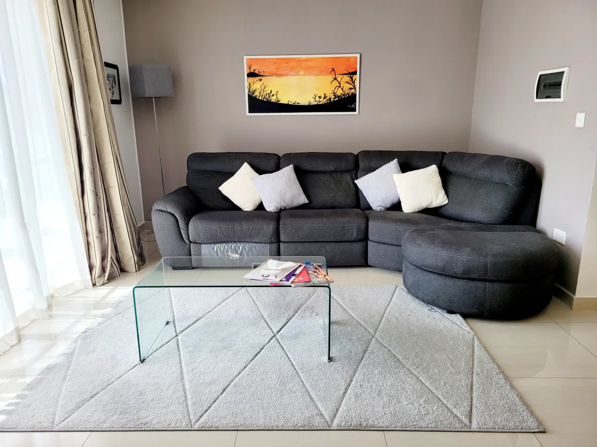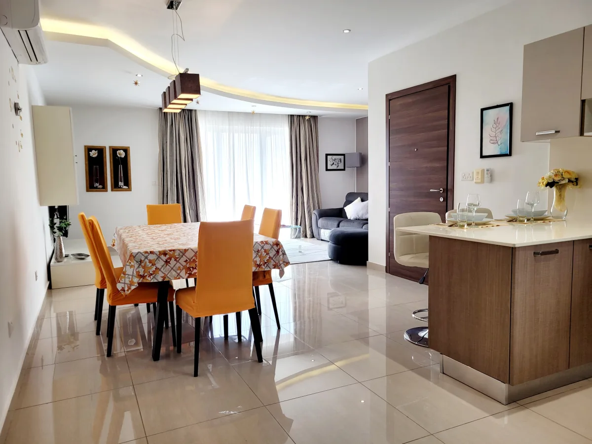 This spacious apartment has been furnished with high quality furniture and is in excellent condition. It comprises a large open plan kitchen with ample storage, a generously sized seating area, a living room with a large flat screen TV and a 4-seater sofa, and a dining area with a spacious front balcony offering ample outdoor space. Additionally, there is a well-lit hallway, a main bathroom, and three well-sized bedrooms, all in modern, mint condition. The main king sized bedroom includes an en-suite bathroom, while the second king size bedroom features a large back balcony overlooking a garden. There is also a brand new third bedroom with two single beds, also overlooking the garden. Air conditioning units are installed in all rooms.
