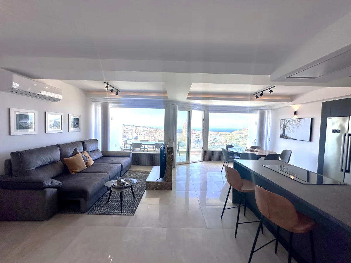 Thoughtfully designed for modern living, the home features an open plan kitchen, dining, and living area that opens onto a spacious terrace, offering spectacular vistas. The property includes three generously sized bedrooms, each with its own en-suite bathroom. One of the bedrooms enjoys the added luxury of a private balcony, perfect for a quiet moment of relaxation. A guest WC and a utility room enhance the functionality of the layout.