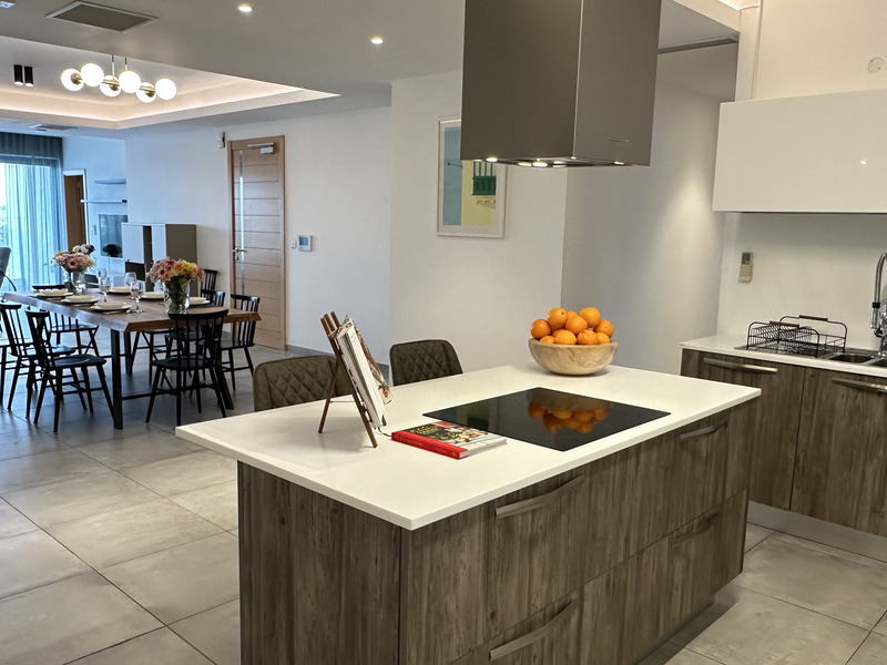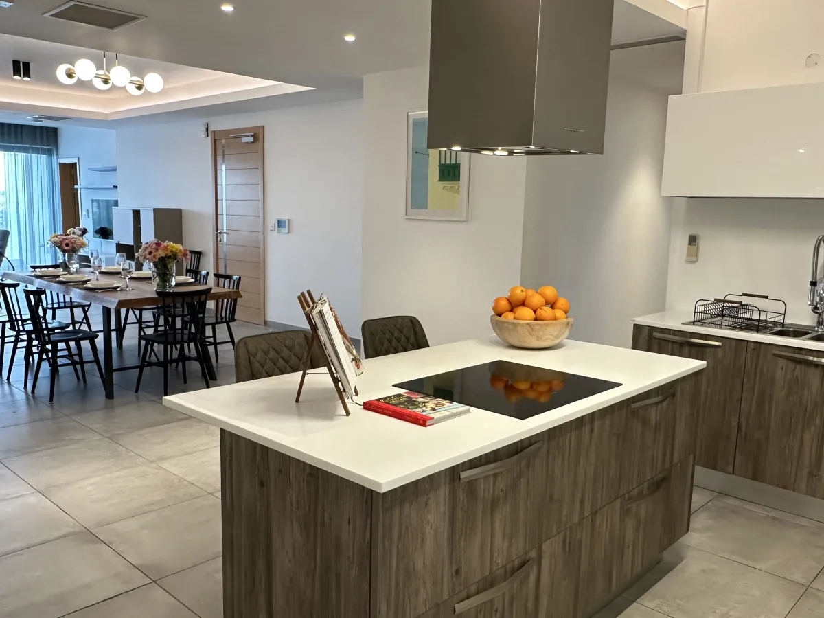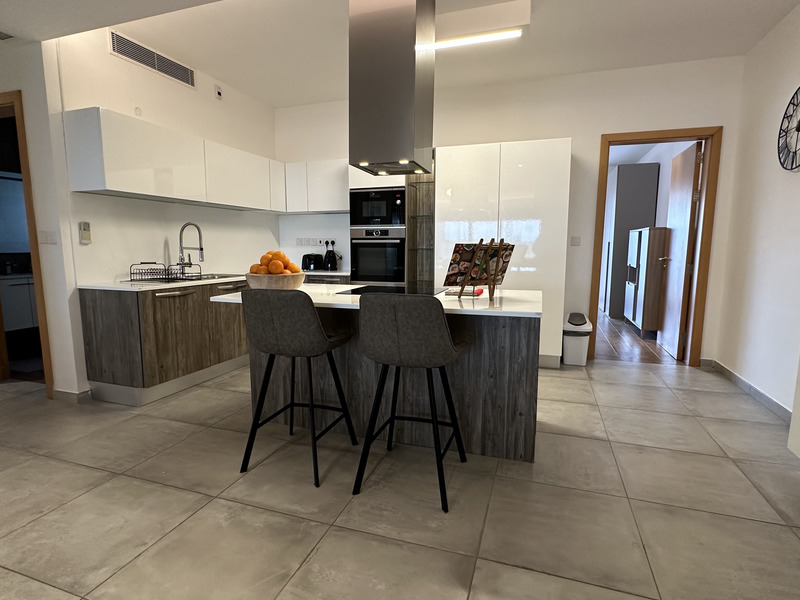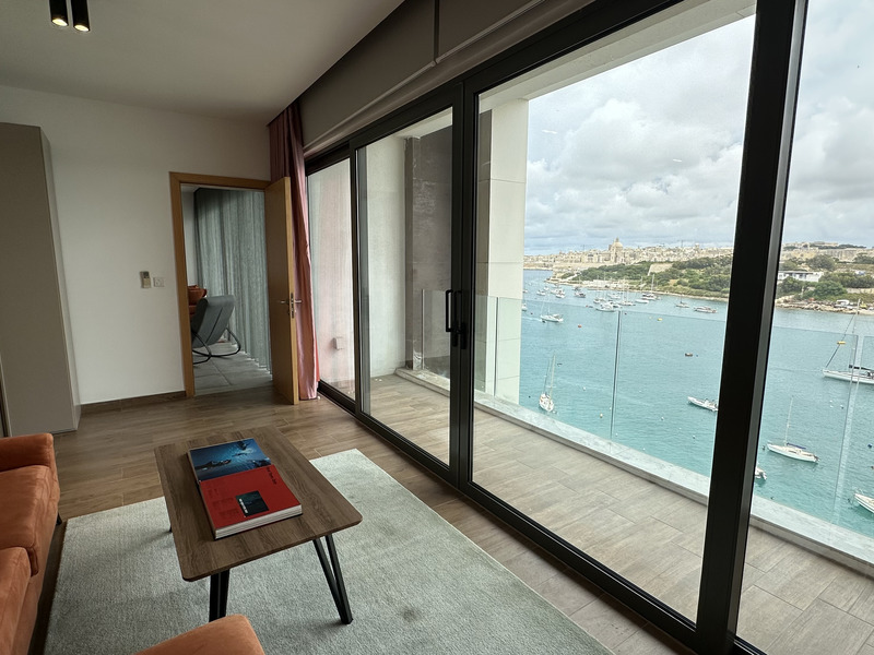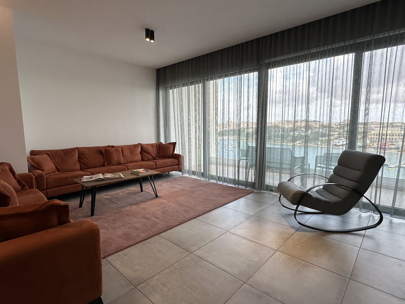 The spacious layout includes a welcoming entrance leading to a large open-plan living, dining and kitchen area, which opens onto a front balcony overlooking Manoel Island and Valletta. The apartment has three double bedrooms, each with en suite facilities. Two are situated at the back and share access to a large rear terrace with jacuzzi, while the main bedroom is at the front and features a large bay window with spectacular views.