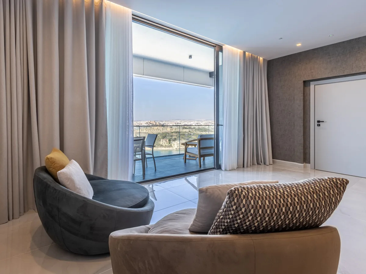 The thoughtfully curated open-plan layout seamlessly integrates a modern, fully equipped kitchen with a spacious living and dining area, leading out to a generous front terrace. This is the ideal setting for sun lounging or for one to enjoy al fresco dining while marvelling at the breathtaking views, creating an idyllic setting for relaxation and entertainment. Comprising three double bedrooms, each accompanied by its own private en-suite bathroom, this residence ensures utmost privacy and convenience for its occupants. Two of the bedrooms boast private terraces overlooking the plaza below, further enhancing the allure of the space. Complimenting the main living spaces are additional amenities including a guest WC for added convenience, a dedicated laundry room for practicality, and a versatile study, offering a secluded workspace ideal for productivity. This remarkable property is offered fully furnished and equipped to the highest standards, from state-of-the-art entertainment systems in every bedroom to luxurious bedding and blackout drapes, no detail has been overlooked in ensuring the utmost comfort and convenience.