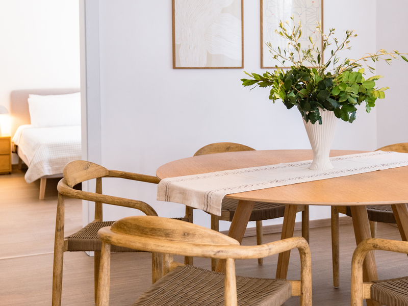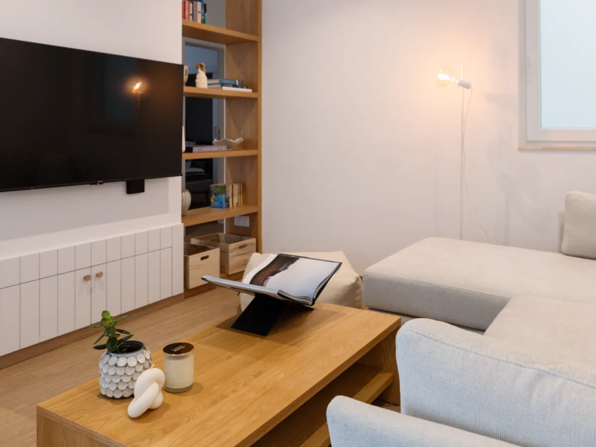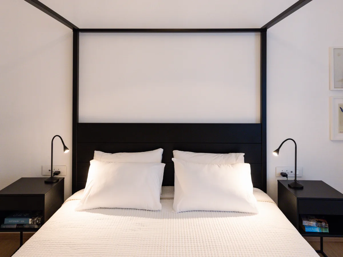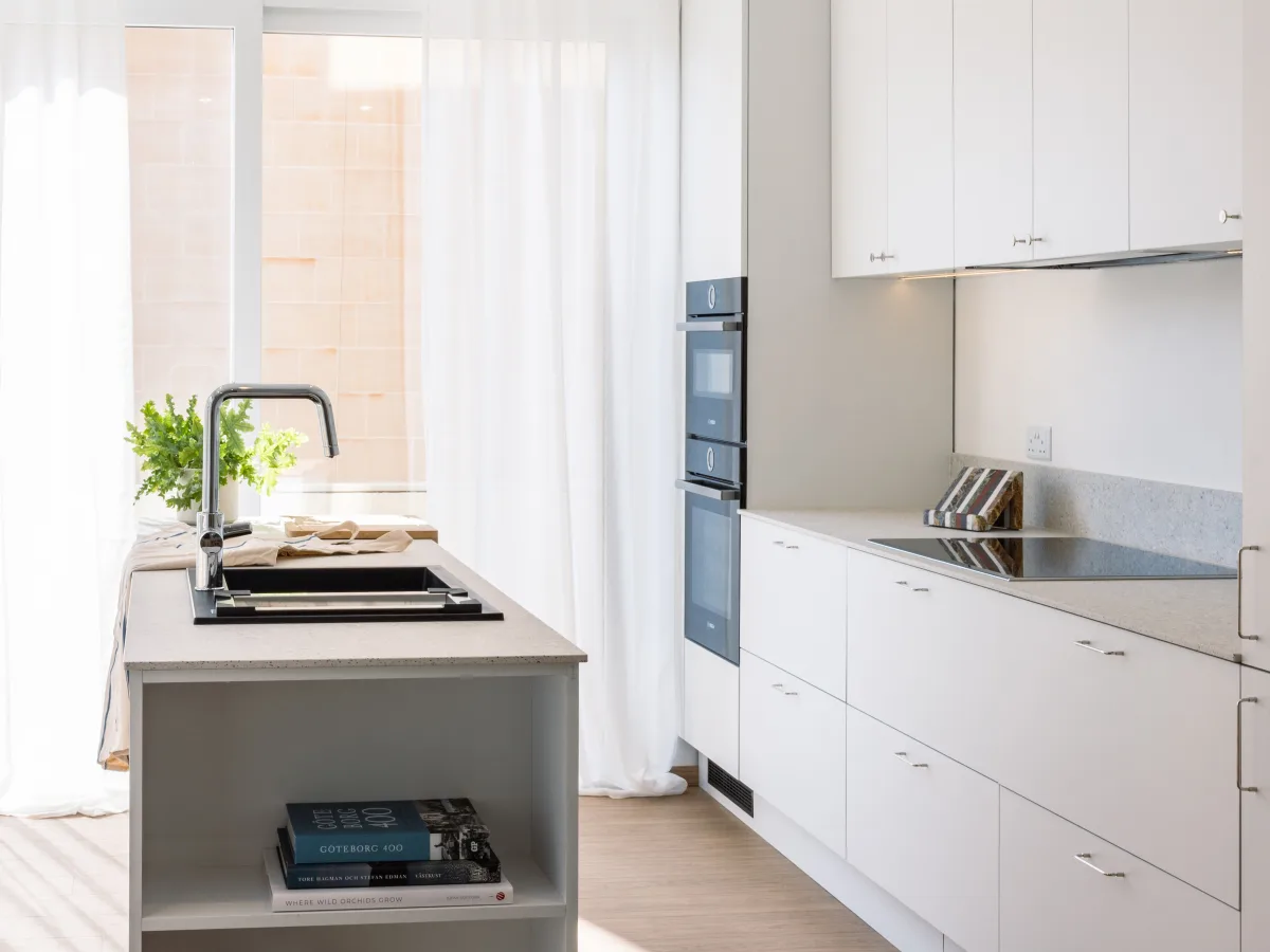The sleek kitchen is fitted with top-of-the-line Bosch appliances, including a 75cm fridge, induction hob, self-cleaning ovens, and a Grohe tap with a reverse osmosis water system. Eco-friendly air conditioning units are installed in every room, and the apartment comes fully furnished with custom-designed furniture for a personalized touch. Additional features include balconies off the kitchen and master bedroom, wooden floors, sound-cancelling windows, and a 55-inch smart TV.