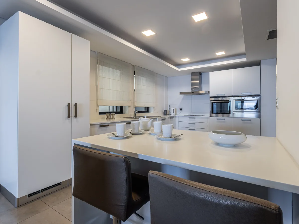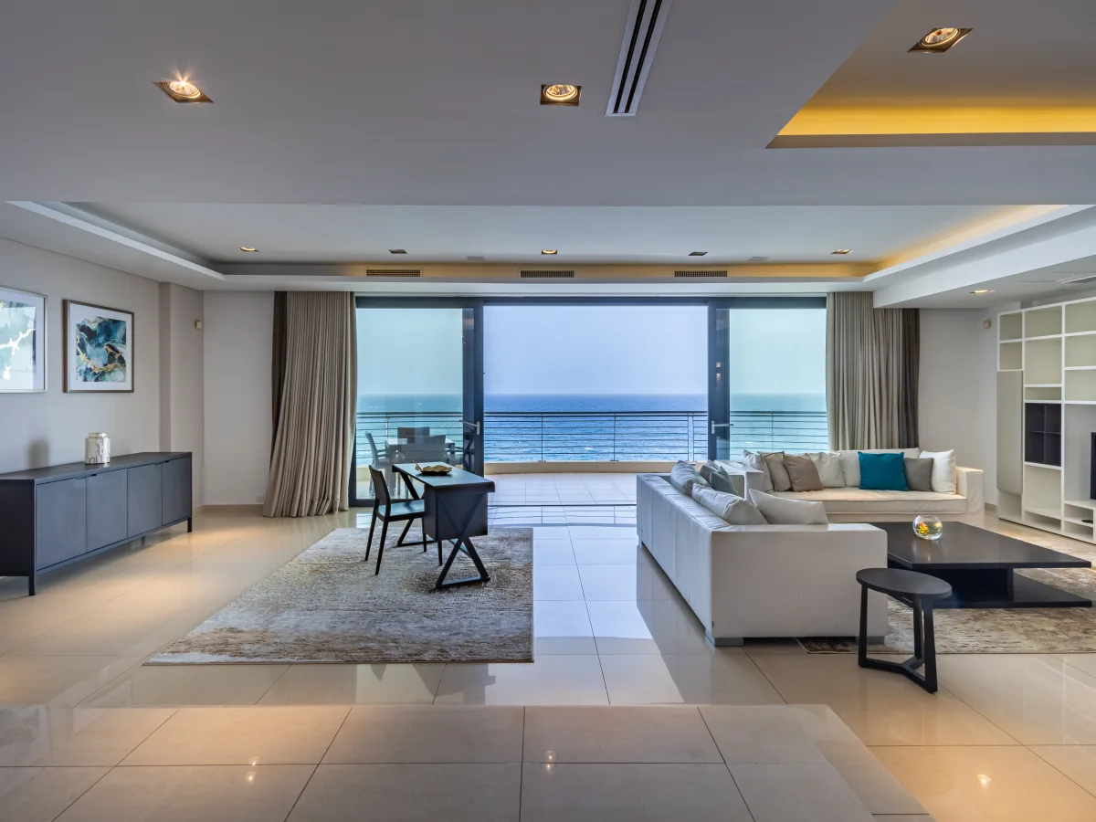 As you step through the inviting hallway, you are greeted by a spacious living and dining area, seamlessly flowing onto a magnificent 24 sqm. terrace that offers an unparalleled vista of the sea. Ideal for lounging and entertaining, this terrace can be enjoyed throughout the day whereas stunning sunsets can also be enjoyed from the spacious lounge and dining room itself. Just beyond the dining area is a fully equipped modern kitchen breakfast room.
