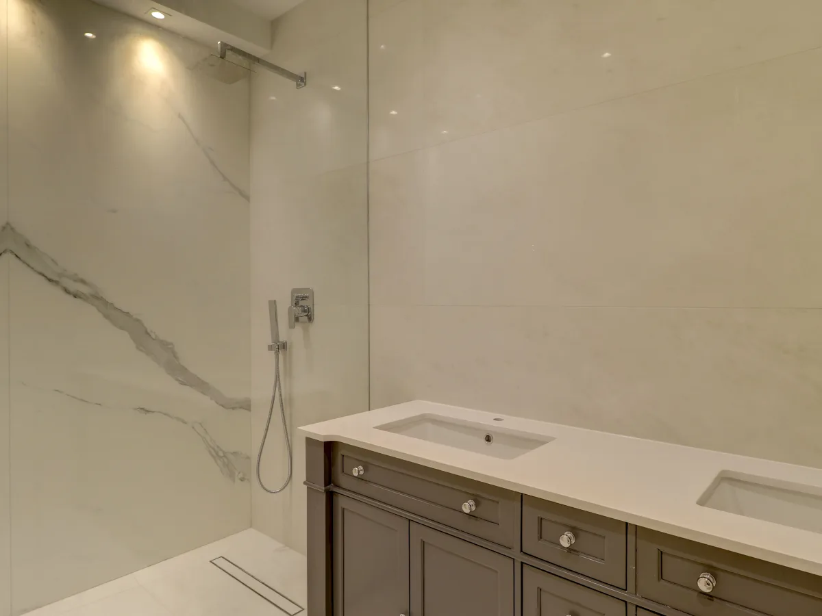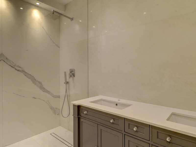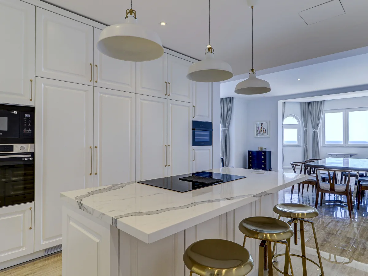 This newly refurbished 200 sqm apartment features 3.3 m high ceilings and and generous indoor and outdoor living. The entrance leads into a lounge area that opens to a light filled living space with access to a large terrace offering fantastic 180 degree sea views. The open plan living area also includes a dining space and a custom built kitchen fitted with a breakfast bar and brand new appliances, full length fridge and freezer, wine cooler, and an induction hob with a central extractor fan.