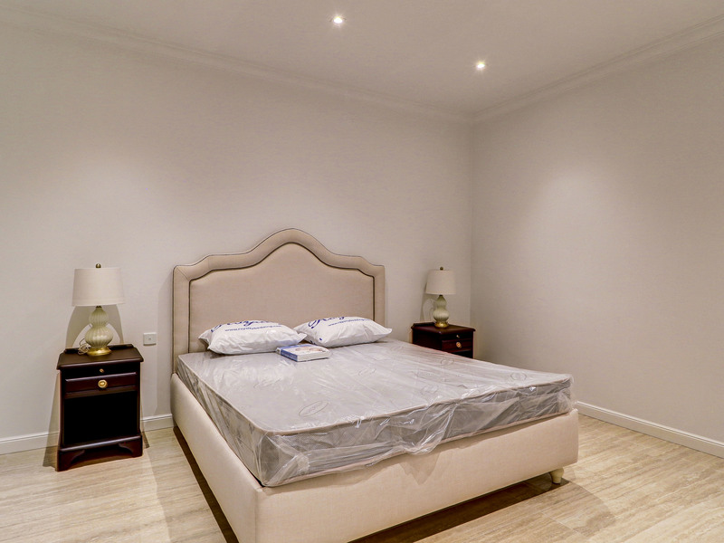 The main bedroom is spacious and elegant, with a large bed and a marble en-suite bathroom that includes both a bath and a shower. There's also a guest bedroom, a study, and a guest shower room. A separate laundry room includes access to an outdoor drying area.
