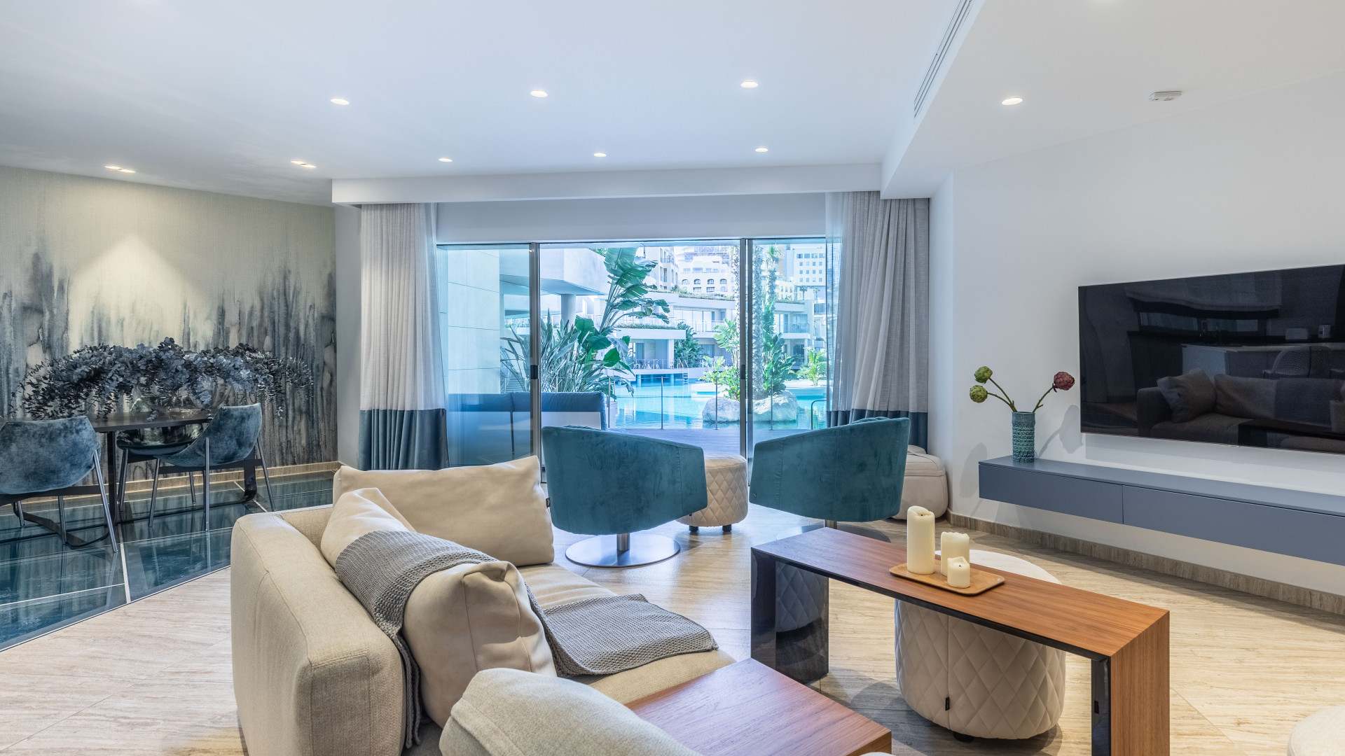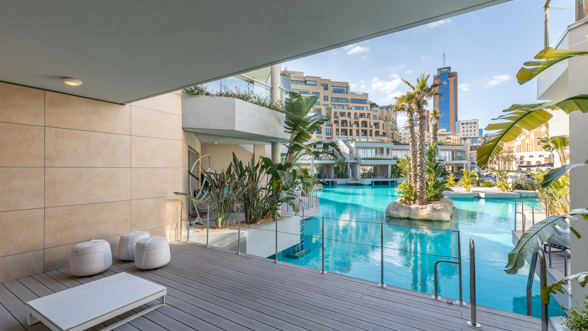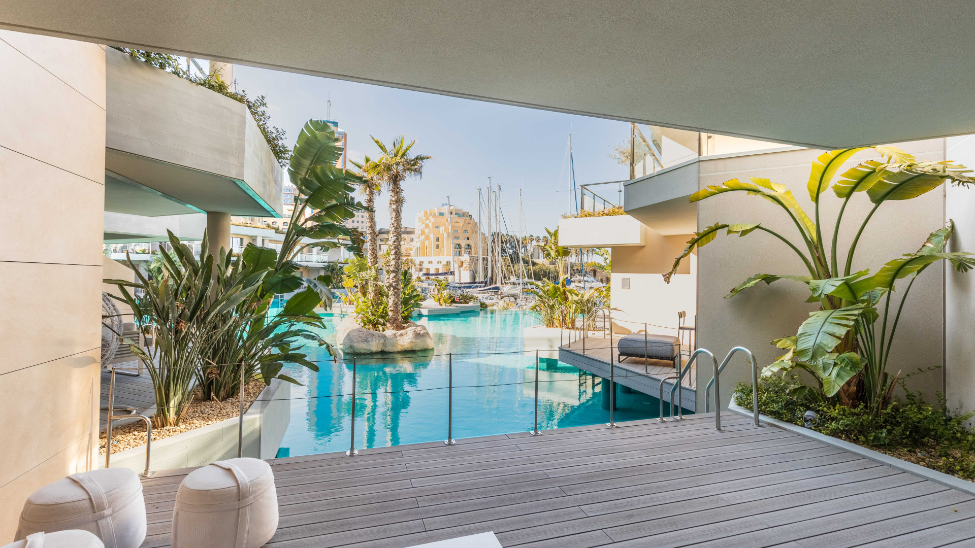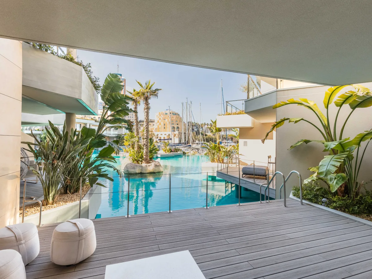This remarkable apartment encompasses three impeccably proportioned double bedrooms, each accompanied by its own en-suite bathroom, deck, and direct access to the swimming pool. Additionally, the lagoon extends beneath the apartment, offering an area equipped with water-jets for added luxury and enjoyment.