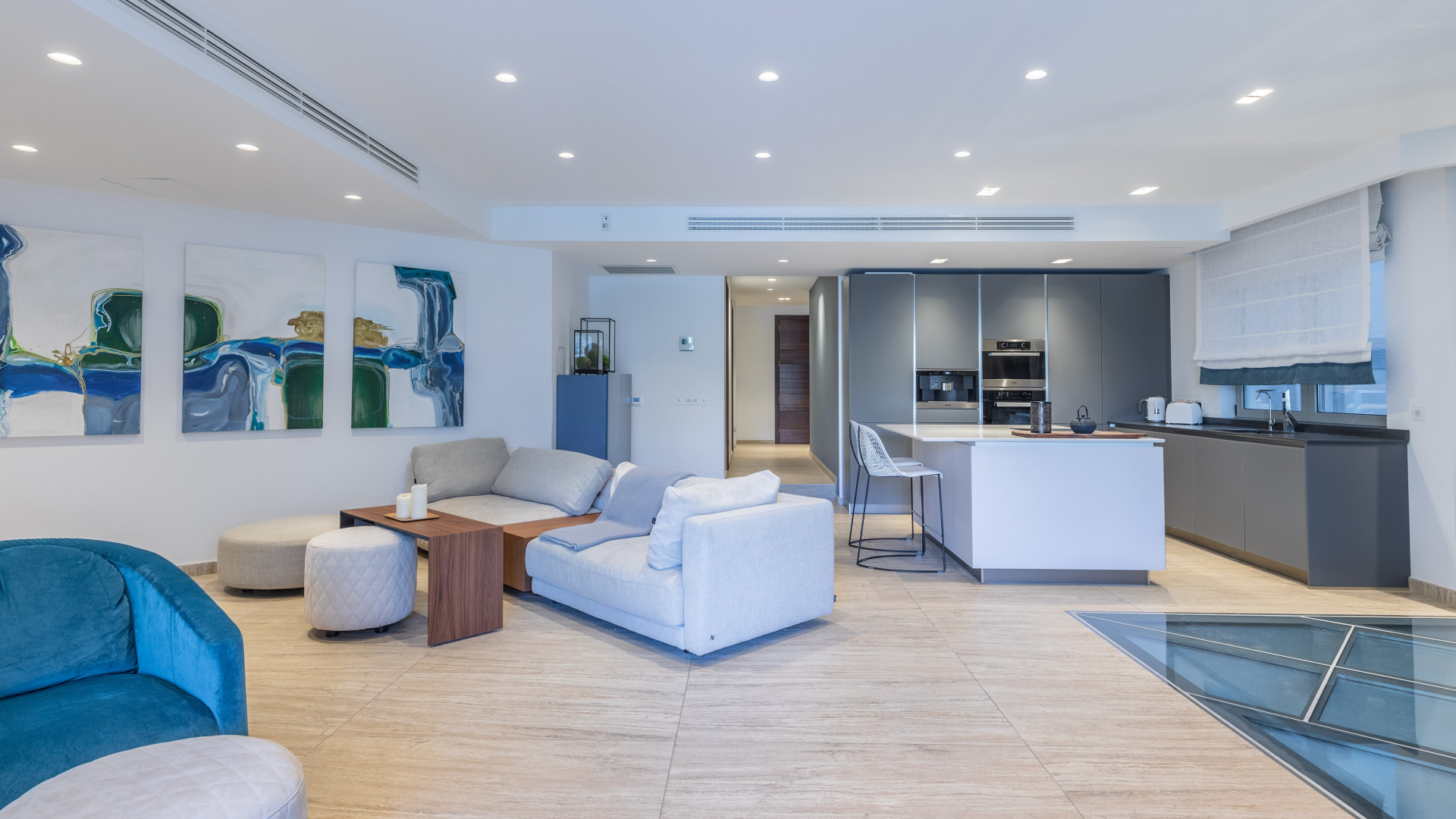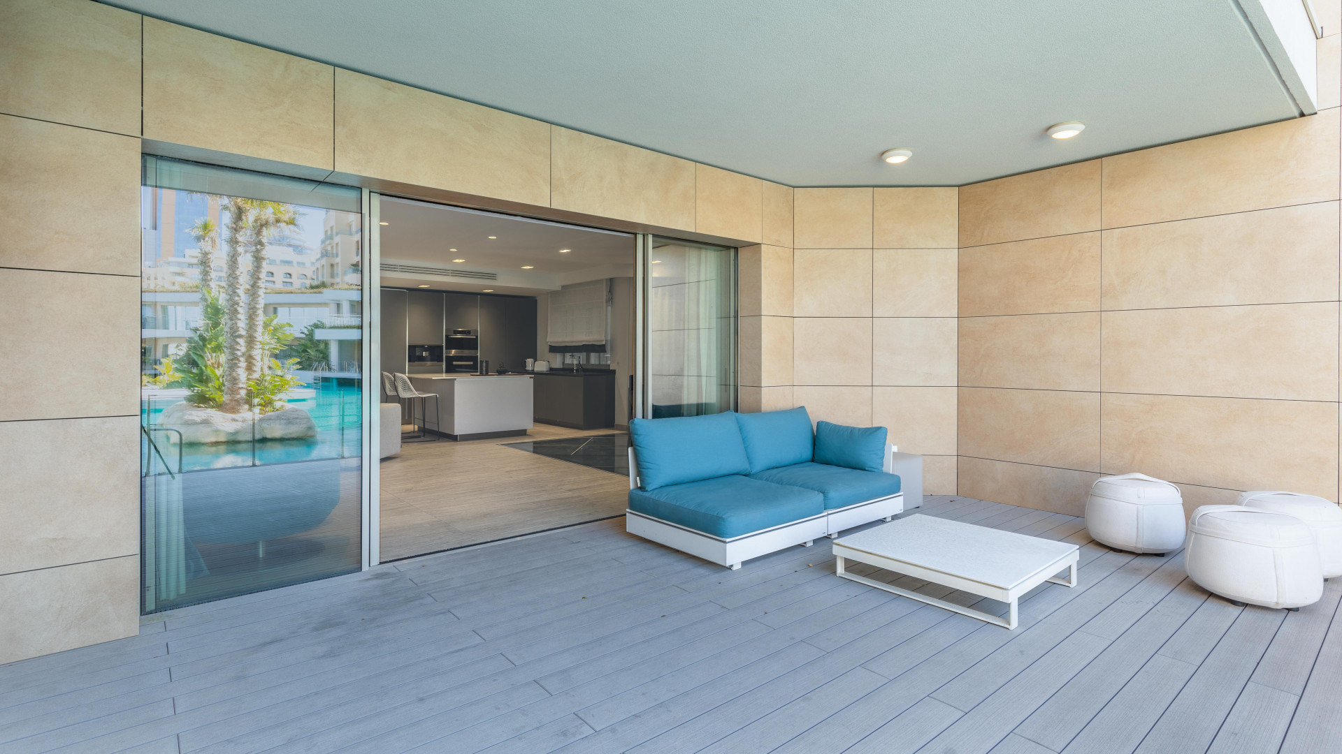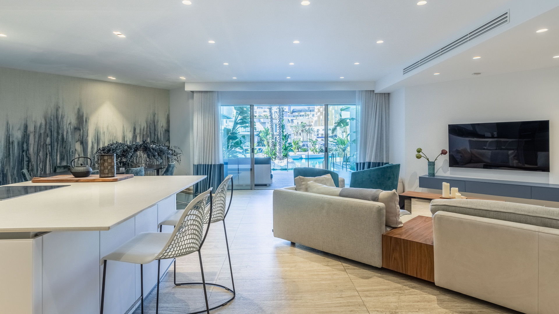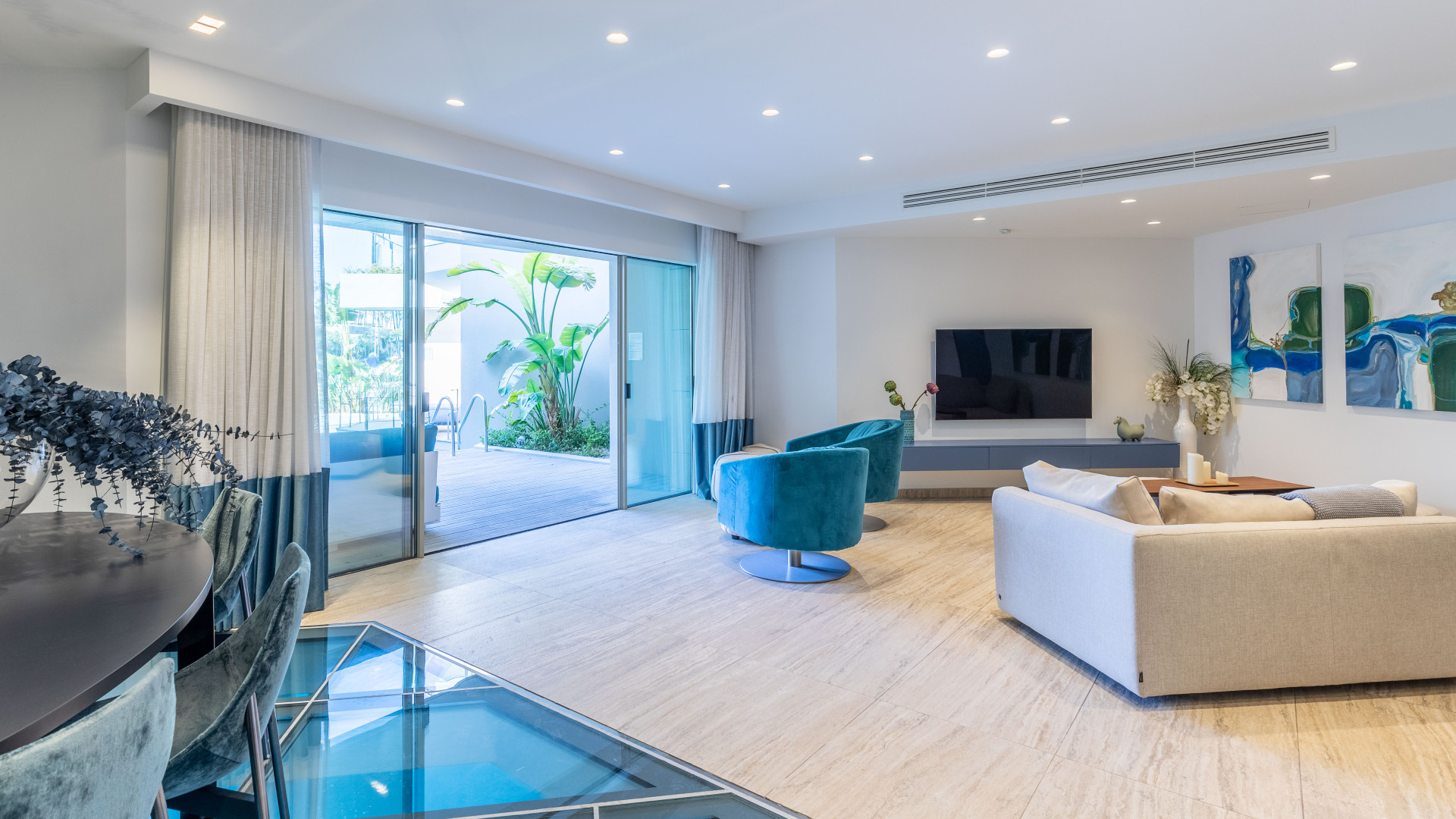 This remarkable apartment encompasses three impeccably proportioned double bedrooms, each accompanied by its own en-suite bathroom, deck, and direct access to the swimming pool. Additionally, the lagoon extends beneath the apartment, offering an area equipped with water-jets for added luxury and enjoyment.