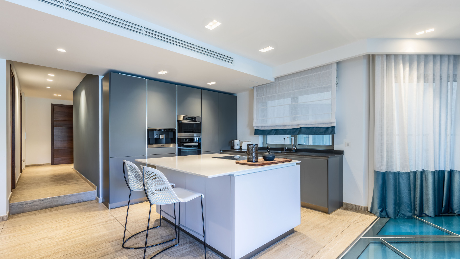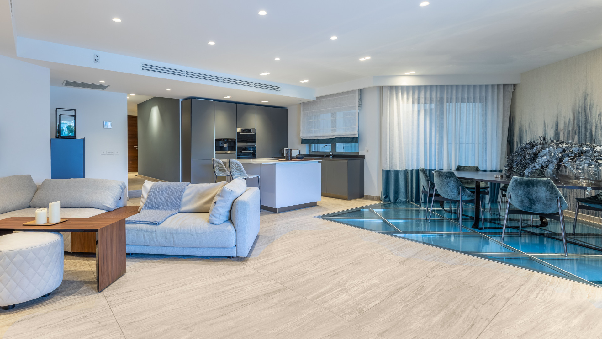 The well-appointed L-shaped kitchen boasts a comfortable size and comes fully equipped with integrated high-quality appliances. Its centerpiece features a kitchen island, adding to both the functionality and aesthetic appeal. Adjacent to the kitchen, the dining area is enhanced by glass flooring overlooking the enchanting turquoise lagoon. By night, the lighting illuminates this feature, creating a truly unique and soothing ambiance.