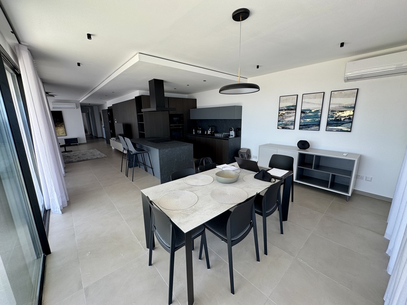 At the heart of the home is an expansive open-plan kitchen, living, and dining area, an airy and inviting space ideal for both daily living and stylish entertaining. Full-length glass doors frame the transition to a beautifully furnished terrace, where sweeping sea views in Malta create a sense of tranquility from sunrise to dusk. This outdoor space, with its seamless indoor-outdoor flow, invites relaxed mornings, alfresco dining, and moments of quiet reflection, all against the backdrop of the open sea.