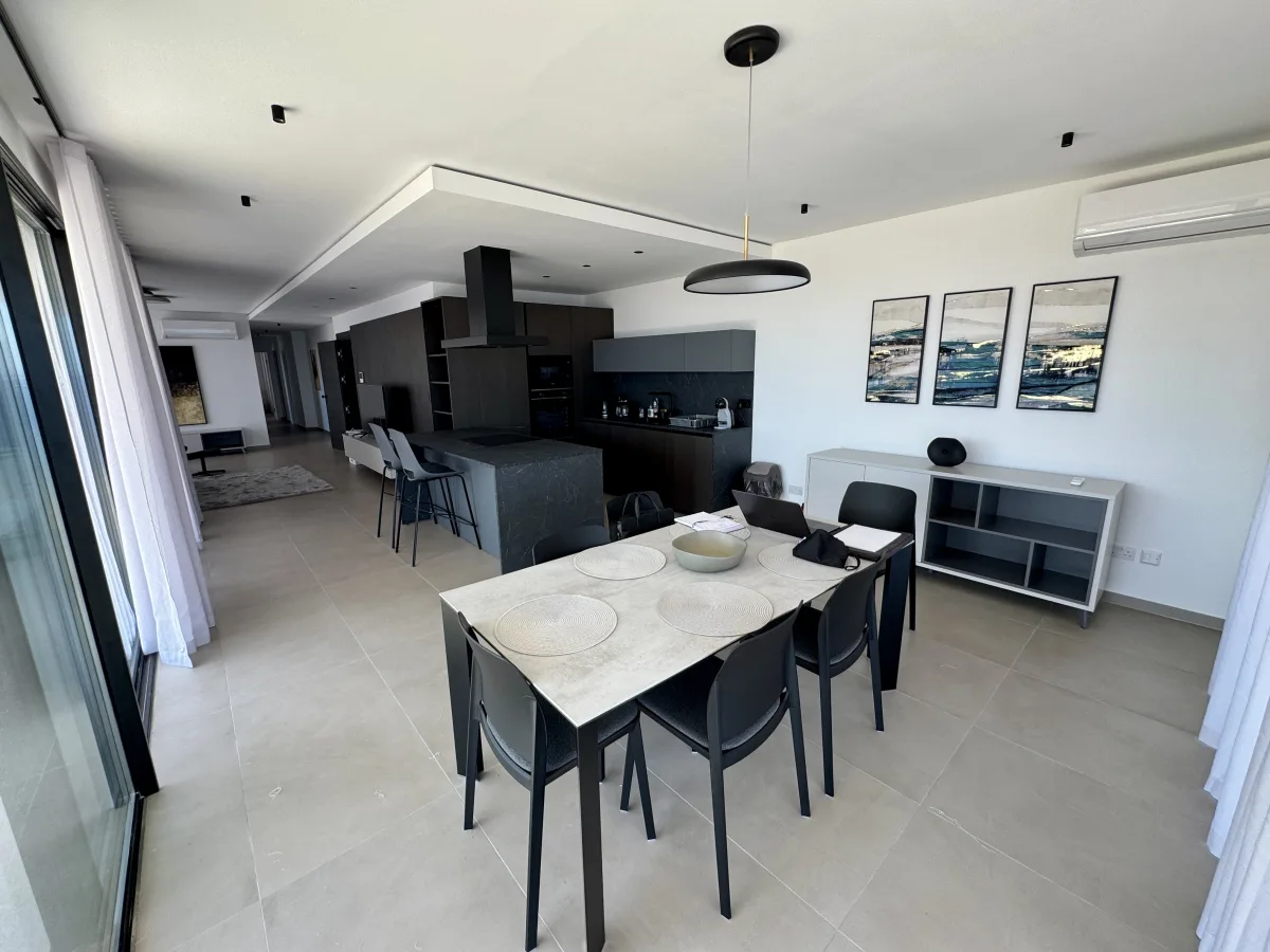 At the heart of the home is an expansive open-plan kitchen, living, and dining area, an airy and inviting space ideal for both daily living and stylish entertaining. Full-length glass doors frame the transition to a beautifully furnished terrace, where sweeping sea views in Malta create a sense of tranquillity from sunrise to dusk. This outdoor space, with its seamless indoor-outdoor flow, invites relaxed mornings, alfresco dining, and moments of quiet reflection, all against the backdrop of the open sea.